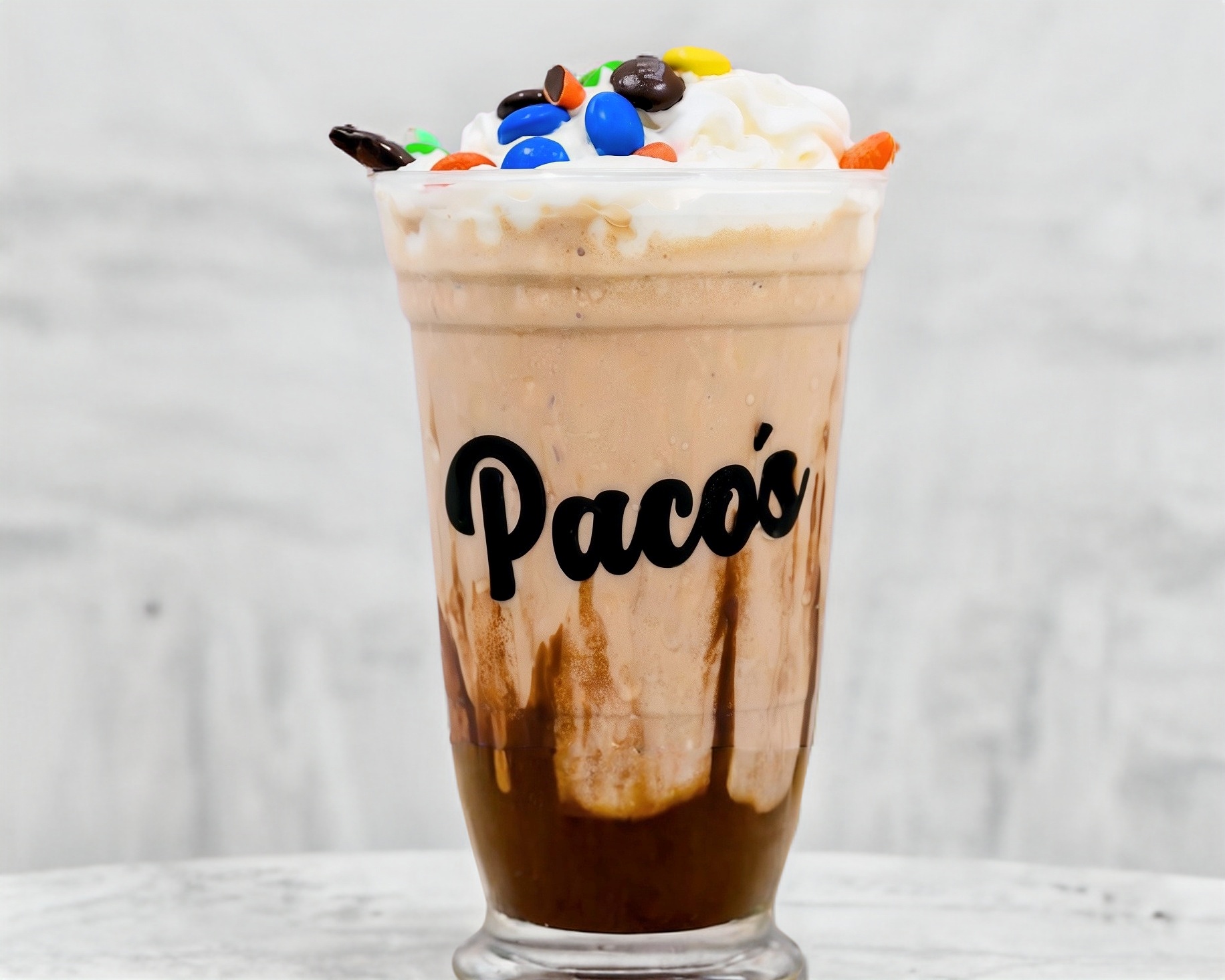 Con helado de vainilla, chocolate en polvo, chocolate líquido, leche semi descremada, crema batida, lunetas de chocolate y galleta de chocolate, tamaño a elegir.