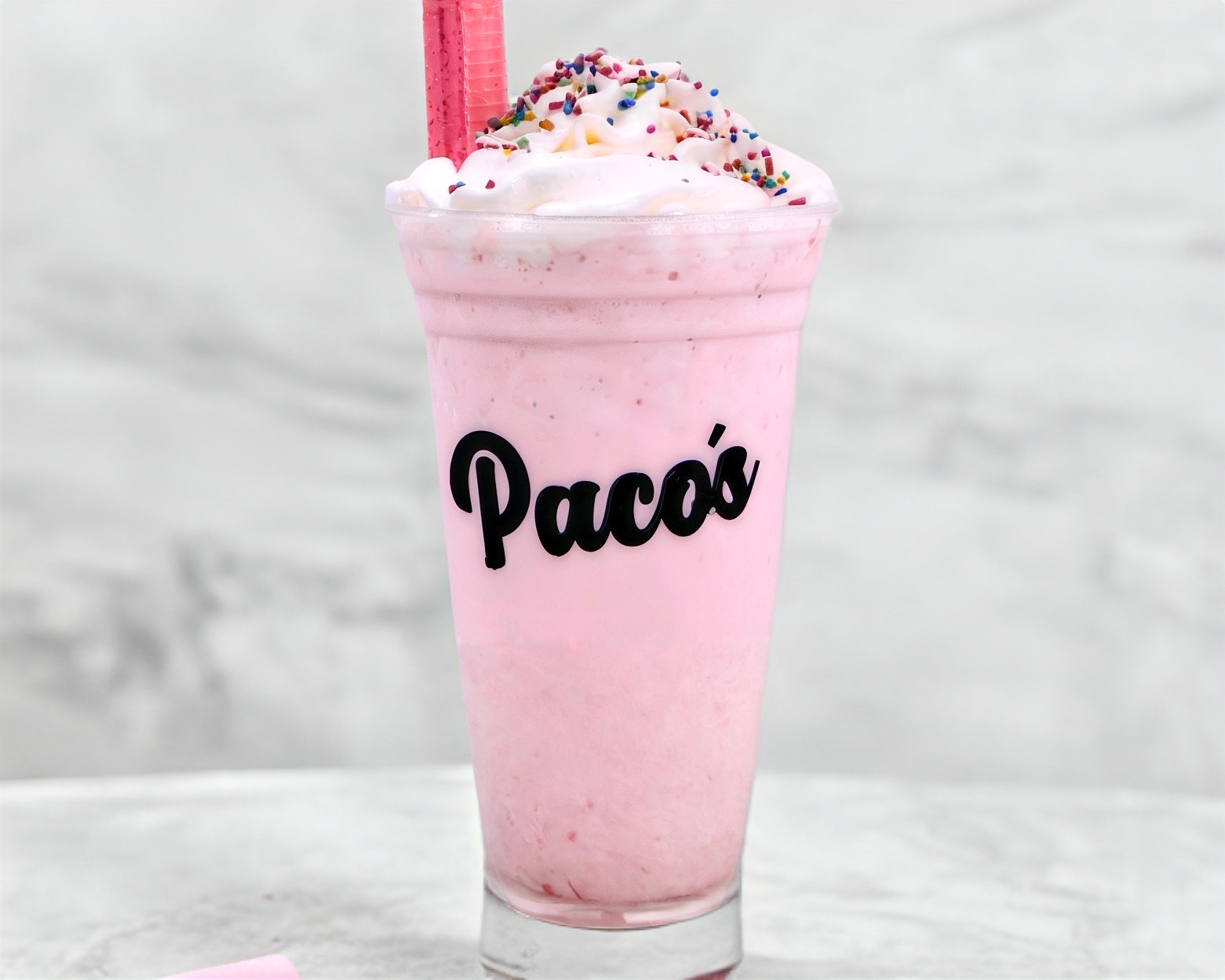 Malteada con helado de fresa, leche semi descremada, fresa, crema batida, sprinkles y galleta de fresa.