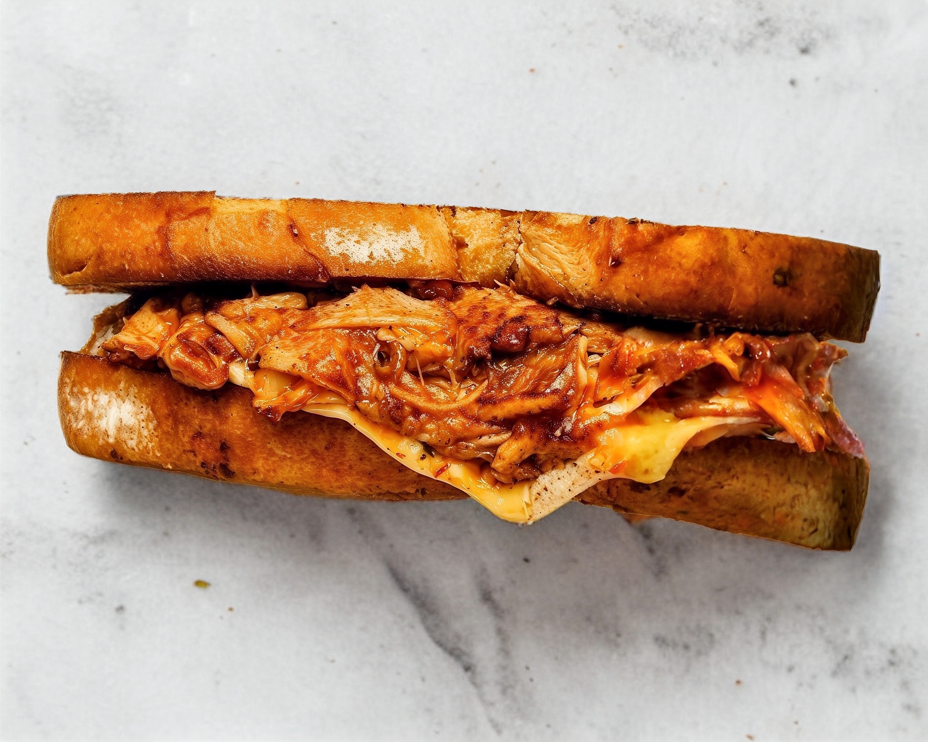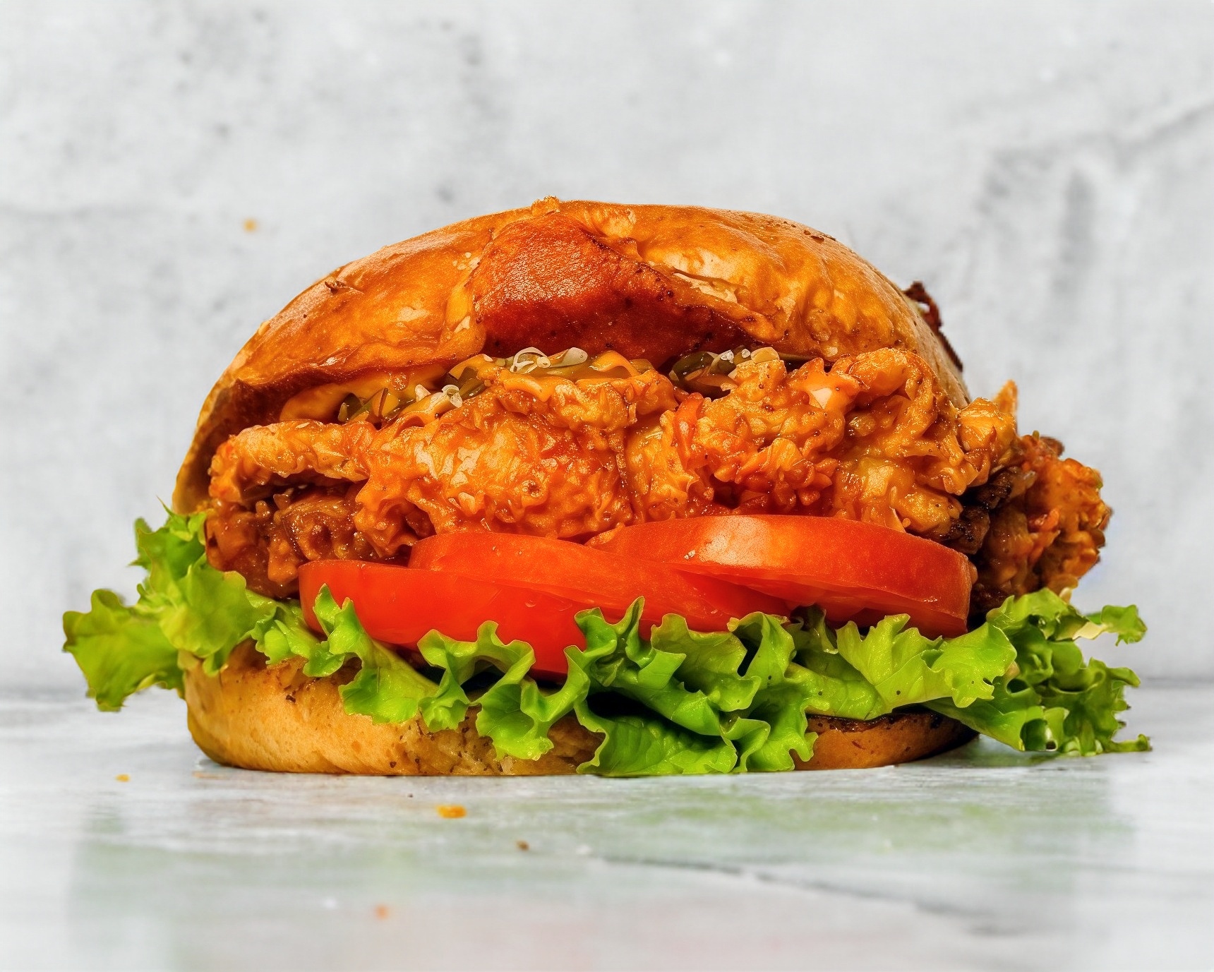 Pollo crispy, pepinillos, chipotle, lechuga y tomate.