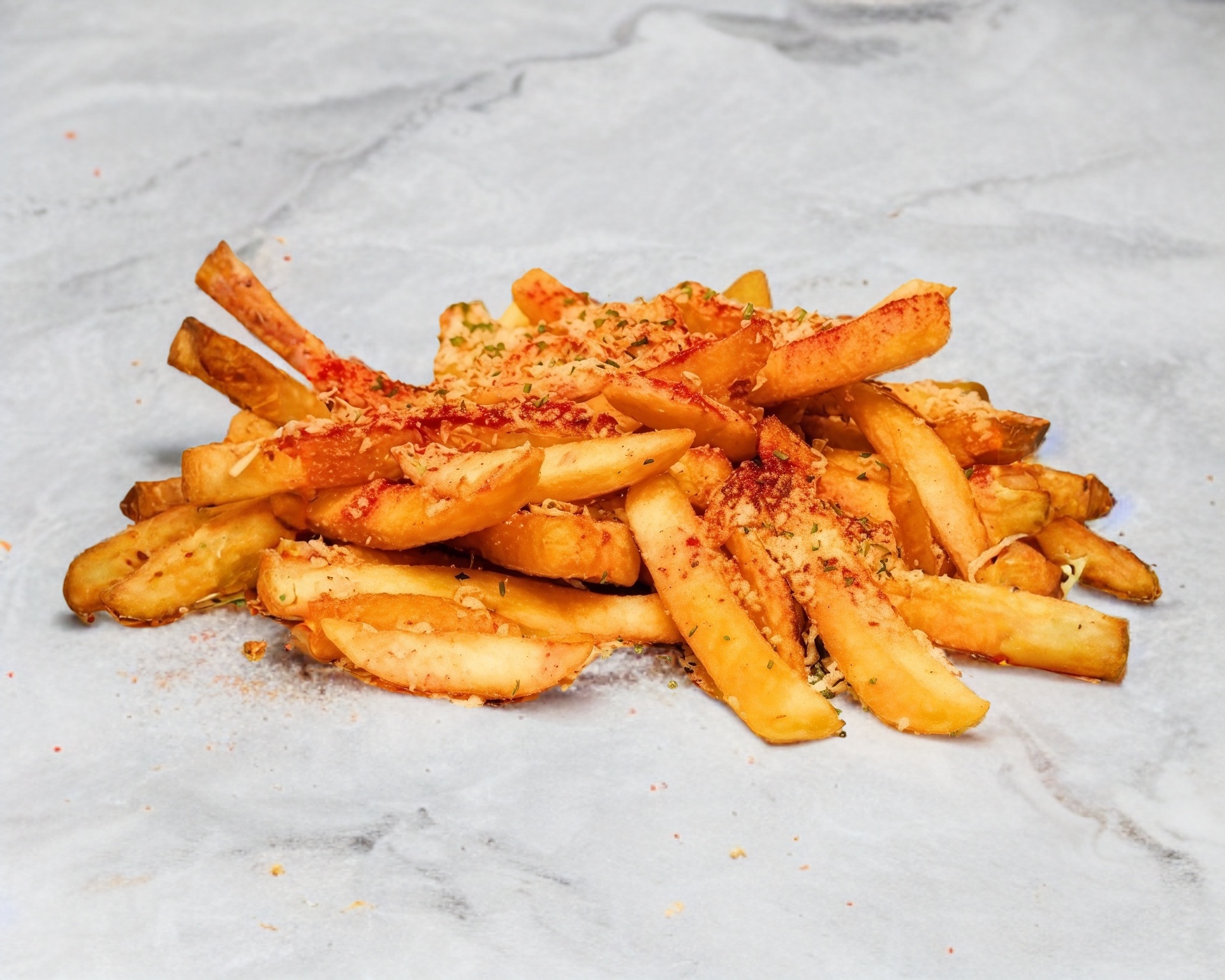 Pepito de arrachera, queso de hebra,pimiento, cebolla caramelizada, lechuga ytomate. (incluye papas a la francesa.).