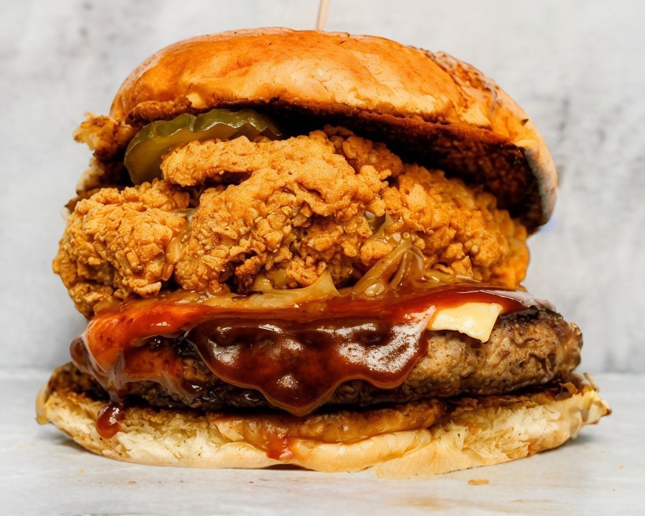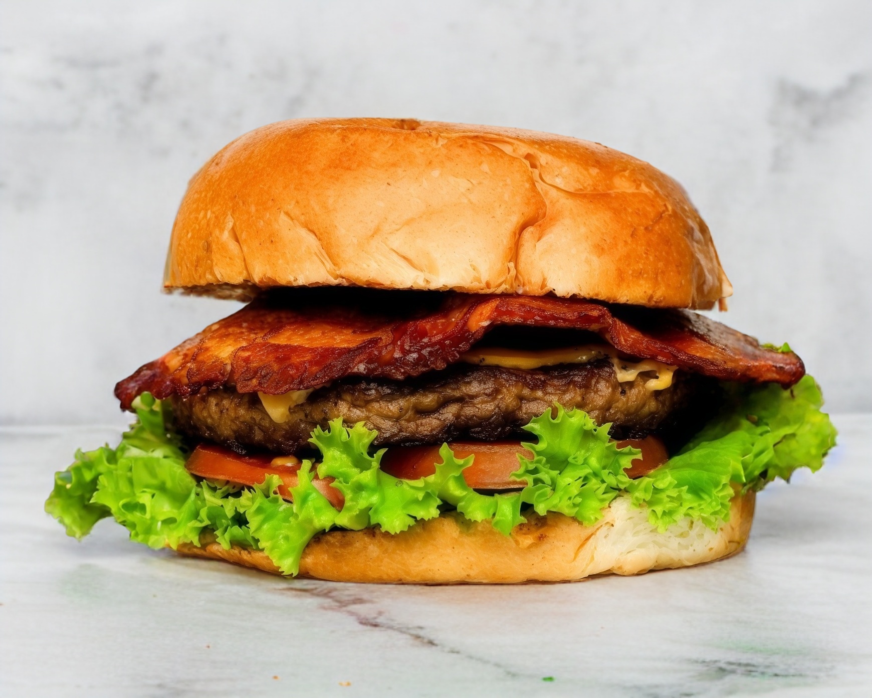 Carne de sirloin, queso americano, cebolla caramelizada, tocino, lechuga y tomate.