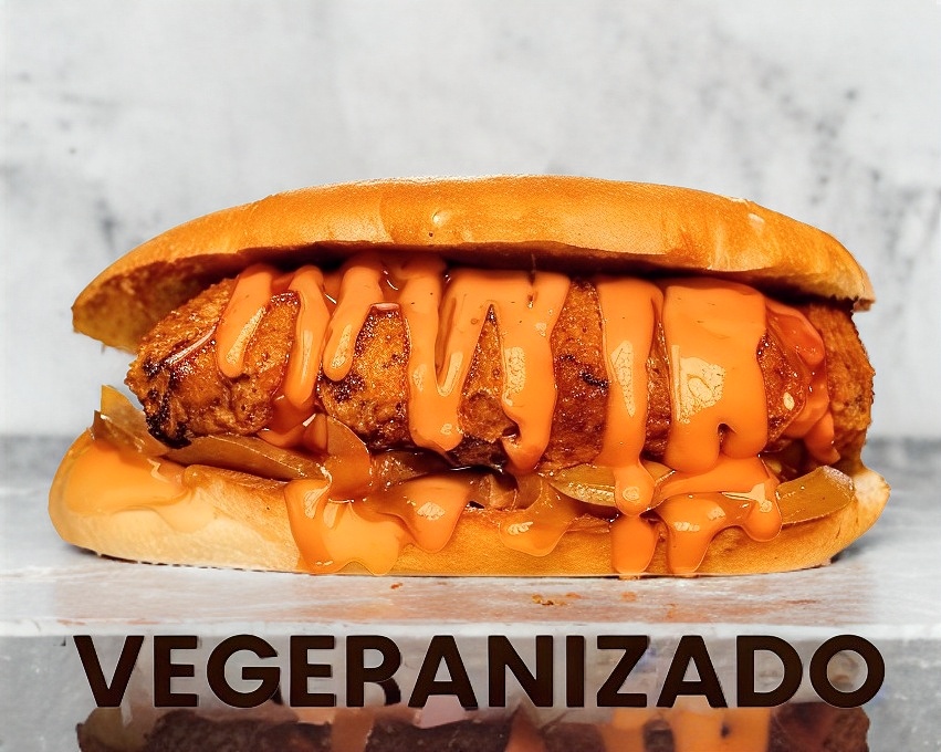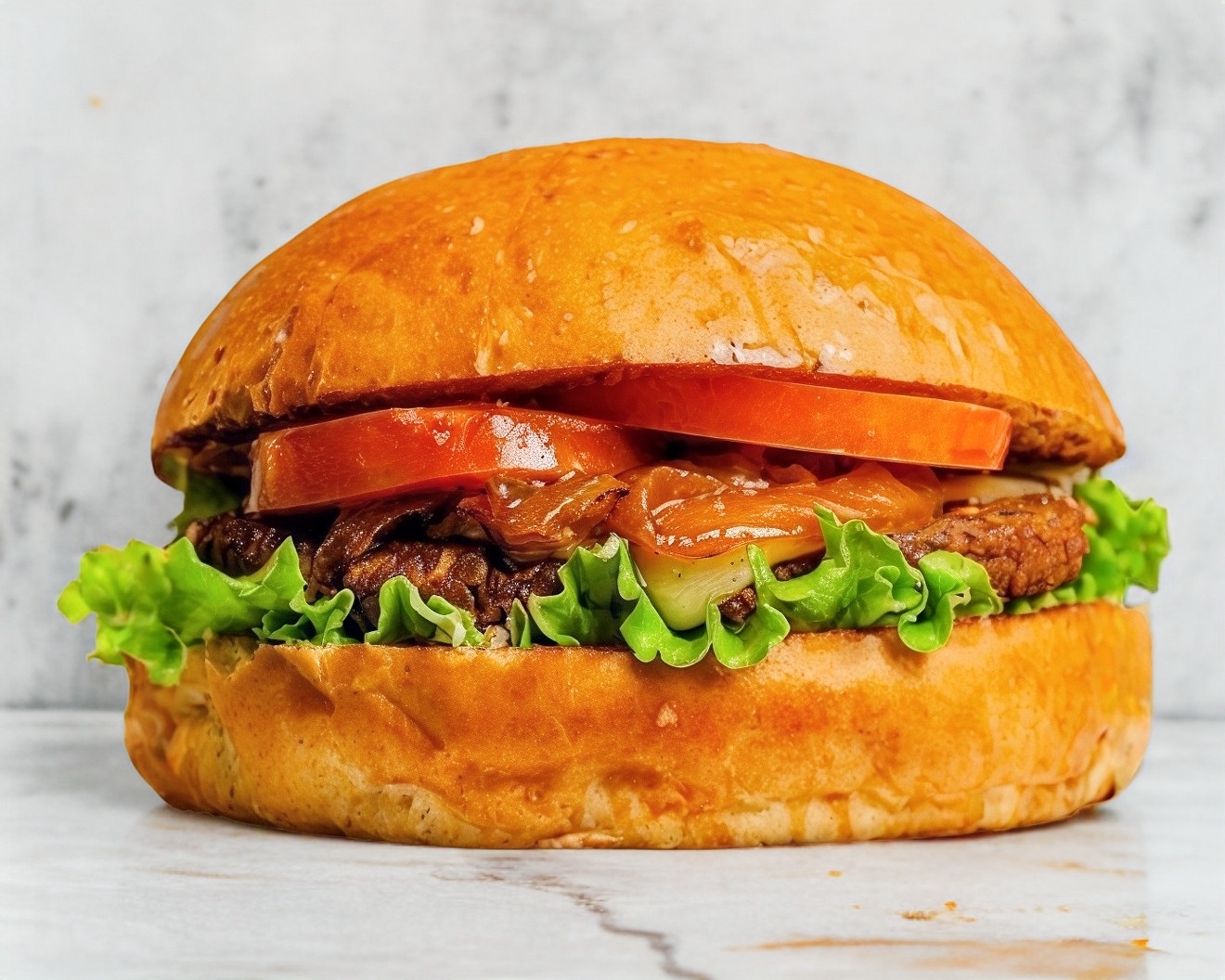 Carne de lentejas, queso gouda cebolla caramelizada, lechuga y tomate.