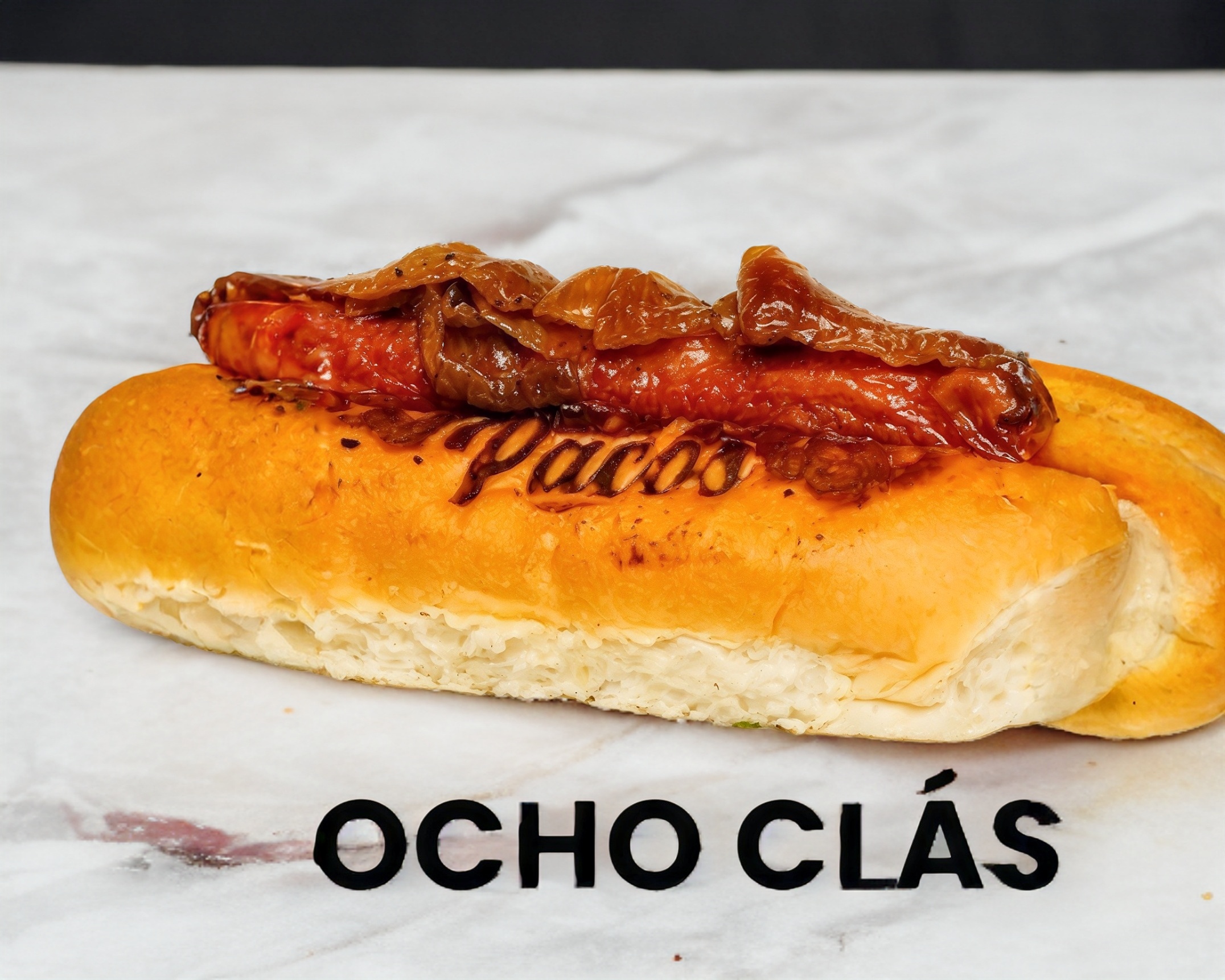 Carne de sirloin, bbq, aros de cebolla, cebolla caramelizada y pepinillos.