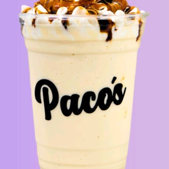 Malteada con helado de vainilla, leche semi descremada, mazapán, crema de cacahuate, crema batida y mazapán espolvoreado, tamaño a elegir.