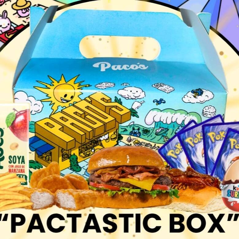 Pajocho clásico o burgir o pac nuggets 5 pzas + baby fries+ huevito kinder + jugo 200 ml + paco´s fun pack (4 cartas pokemón) .