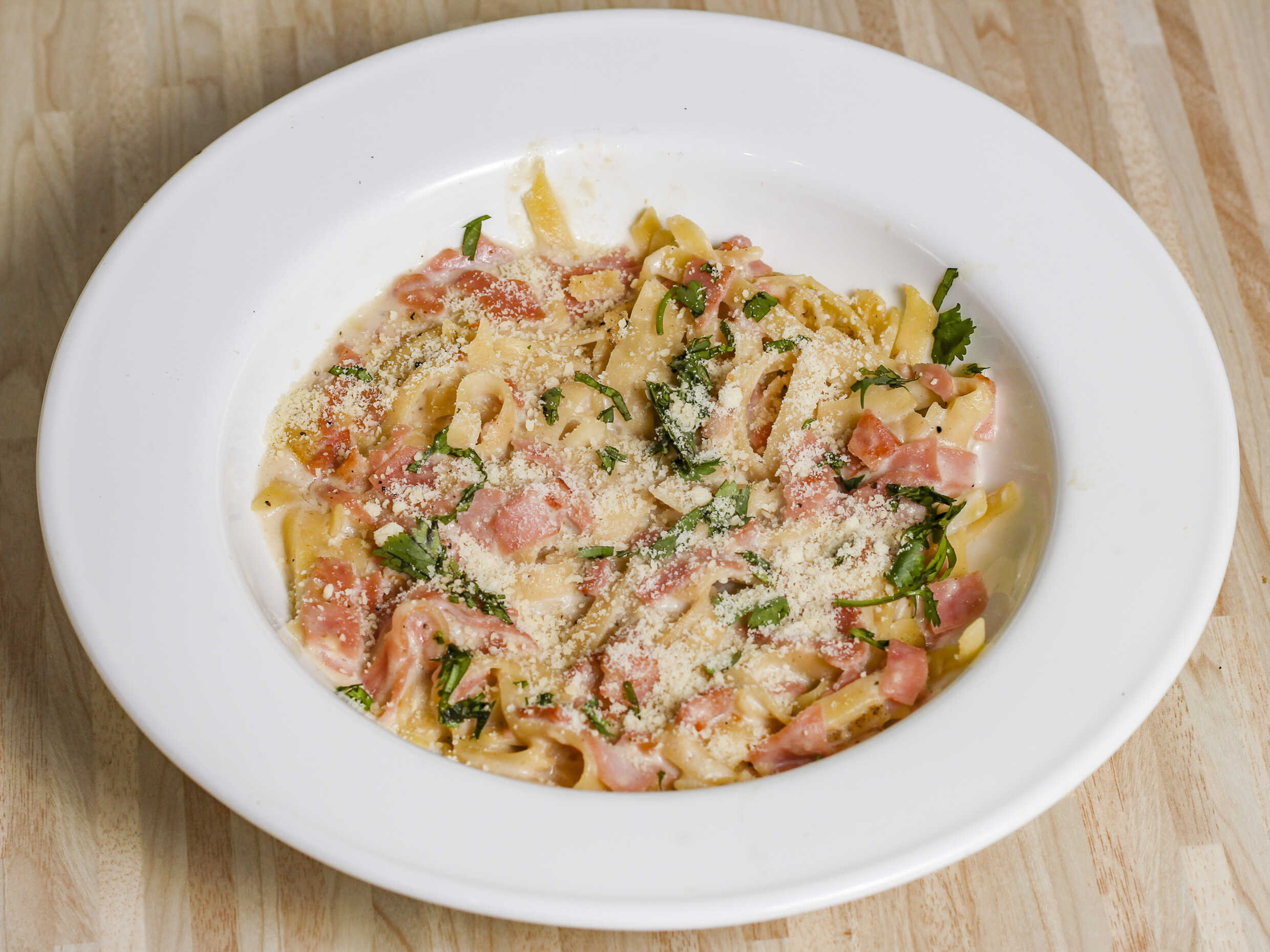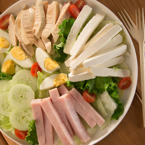Mix de hojas, julianas de tomate, huevo duro, jamón de pavo, tiras de pollo, queso panela y aderezco césar.