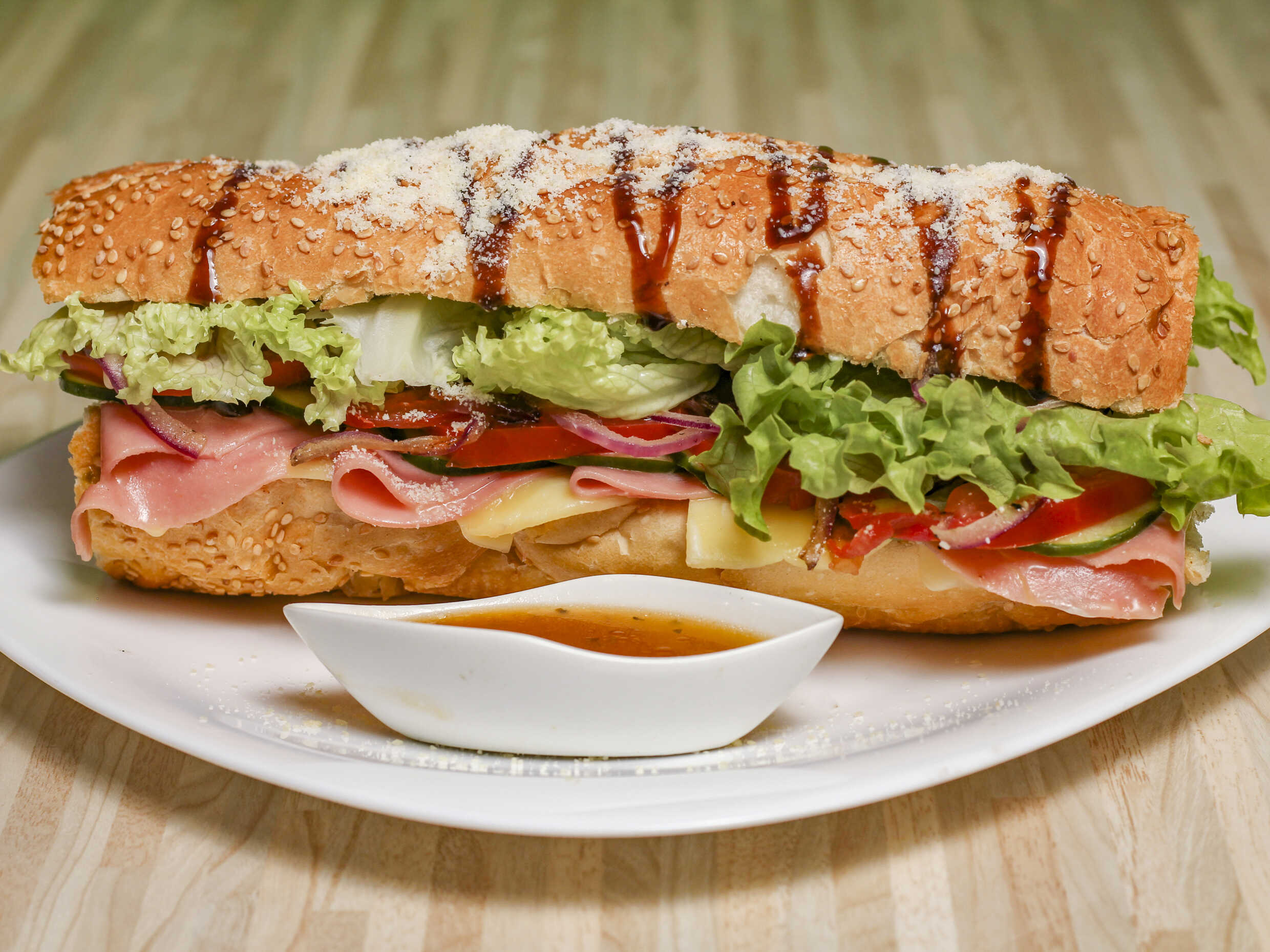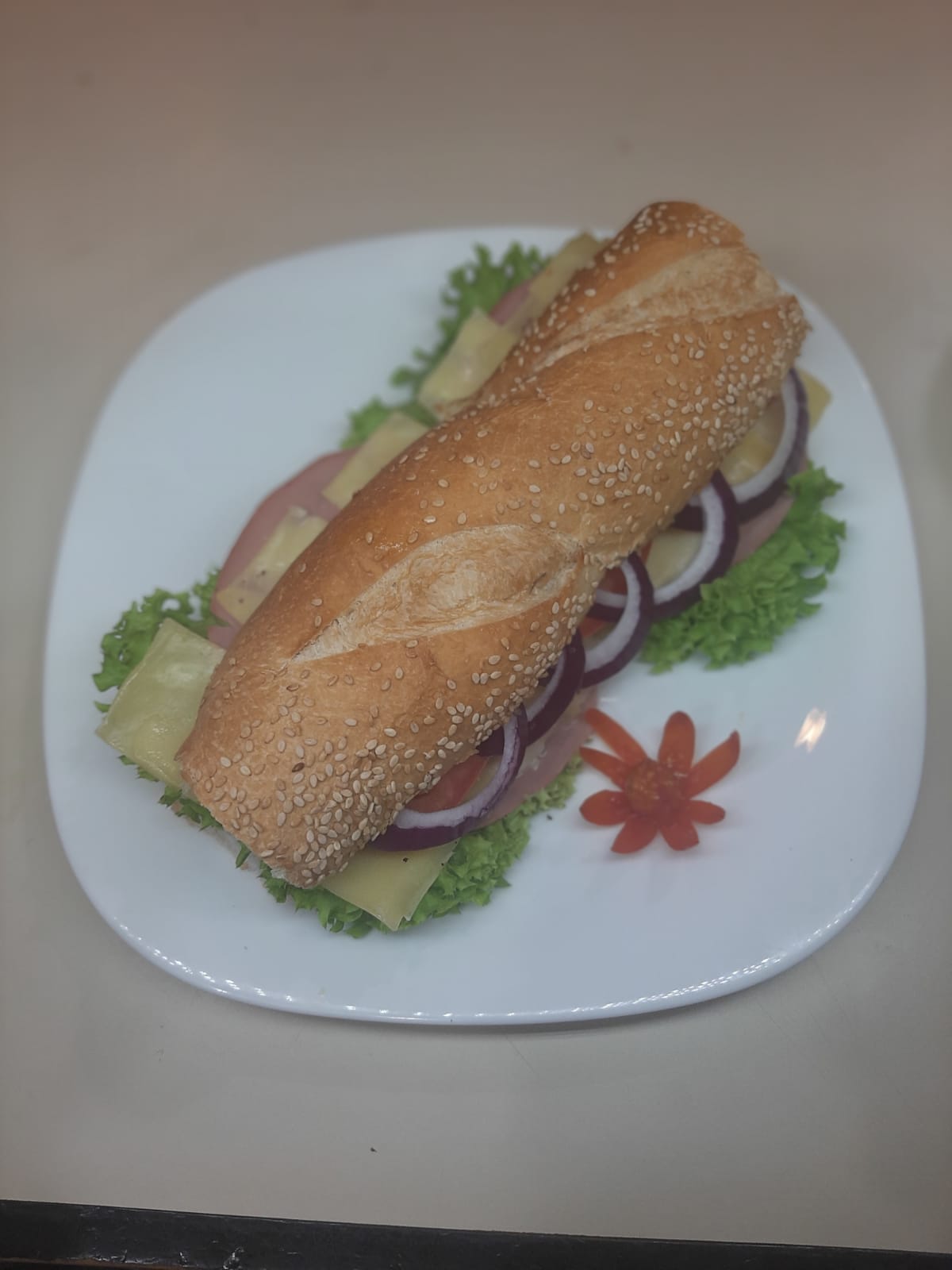 Pan blanco o integral con jamón de pavo y queso amarillo o queso manchego, mix de hojas y aguacate.