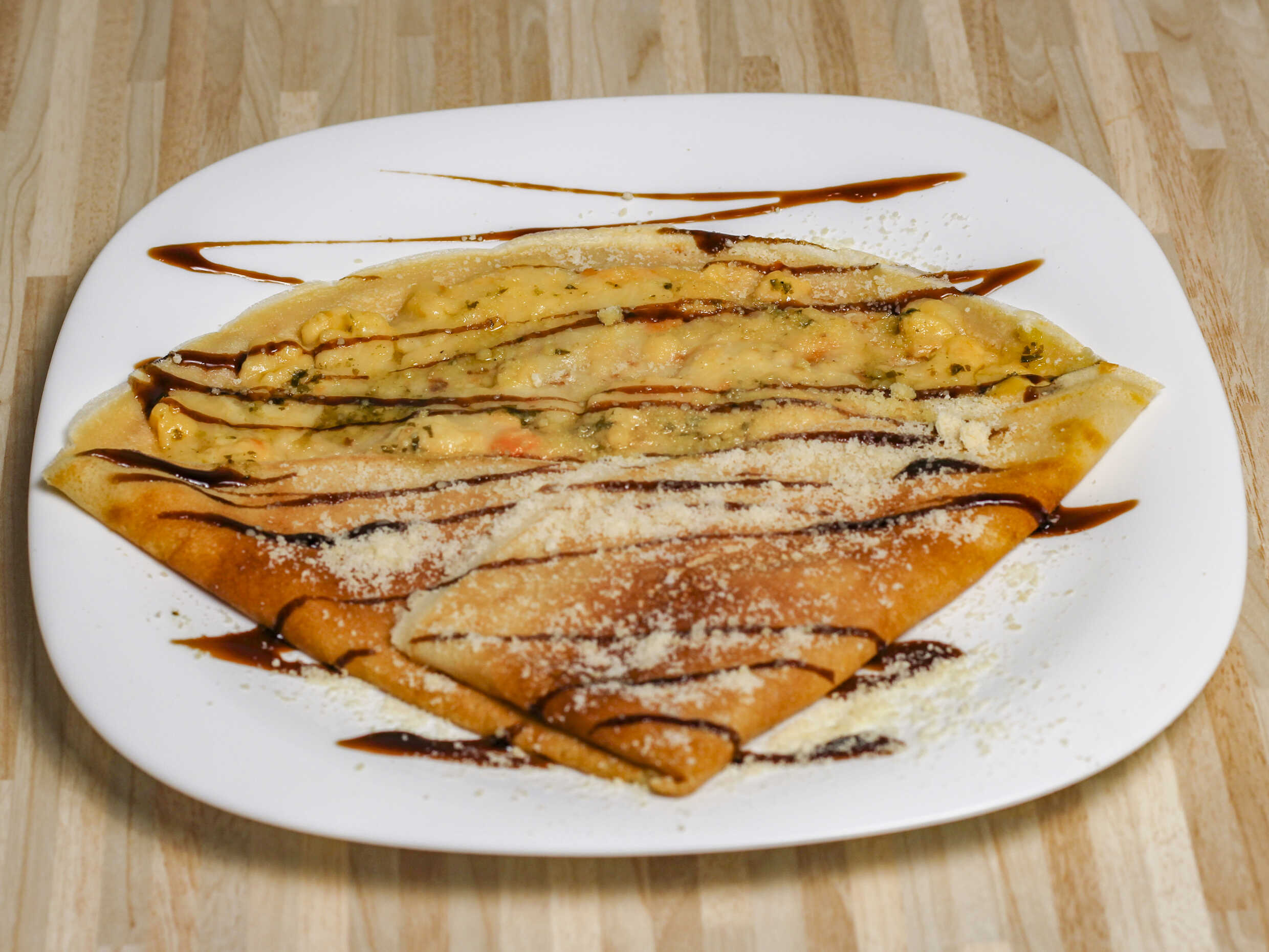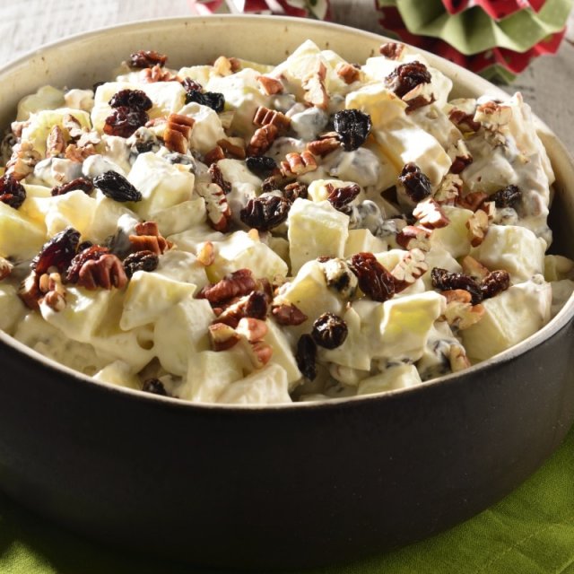 Mix de hojas, lunas de manzanas, nuez, arándanos, láminas de pepino y aderezo de 4 quesos.