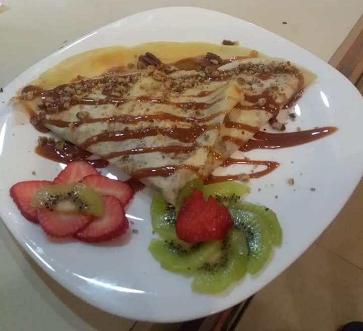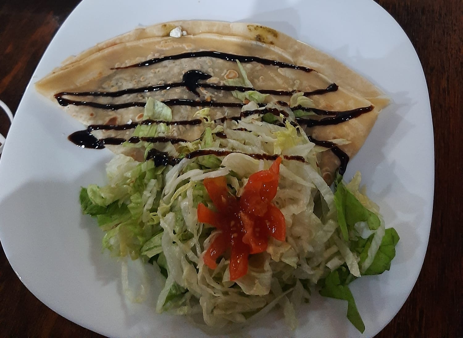 Totopos bañados con salsa roja o verde, fajitas de pollo, media crema, queso y aros de cebolla. Acompañados de plátanos fritos y frijoles.