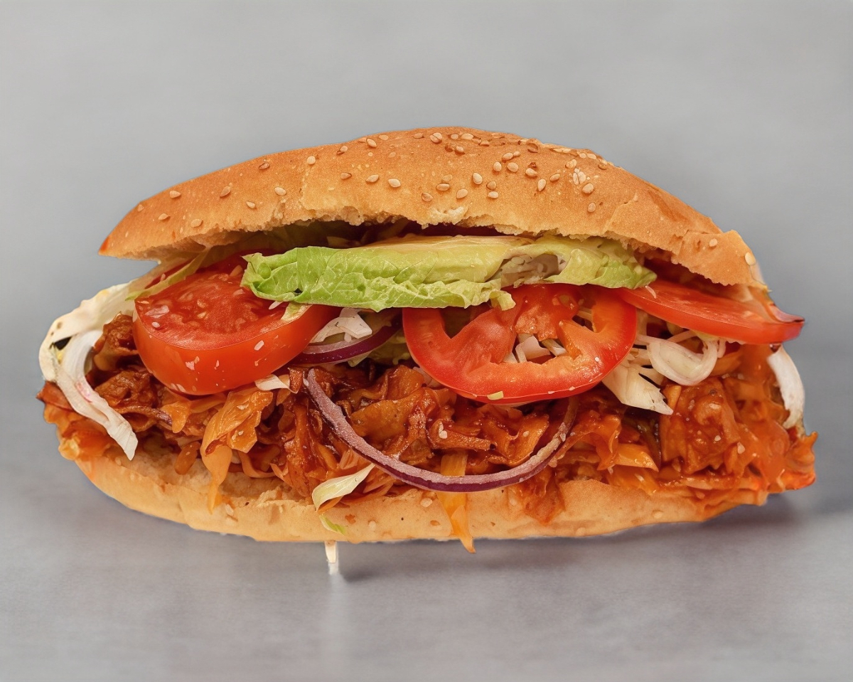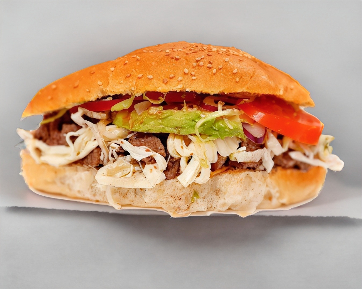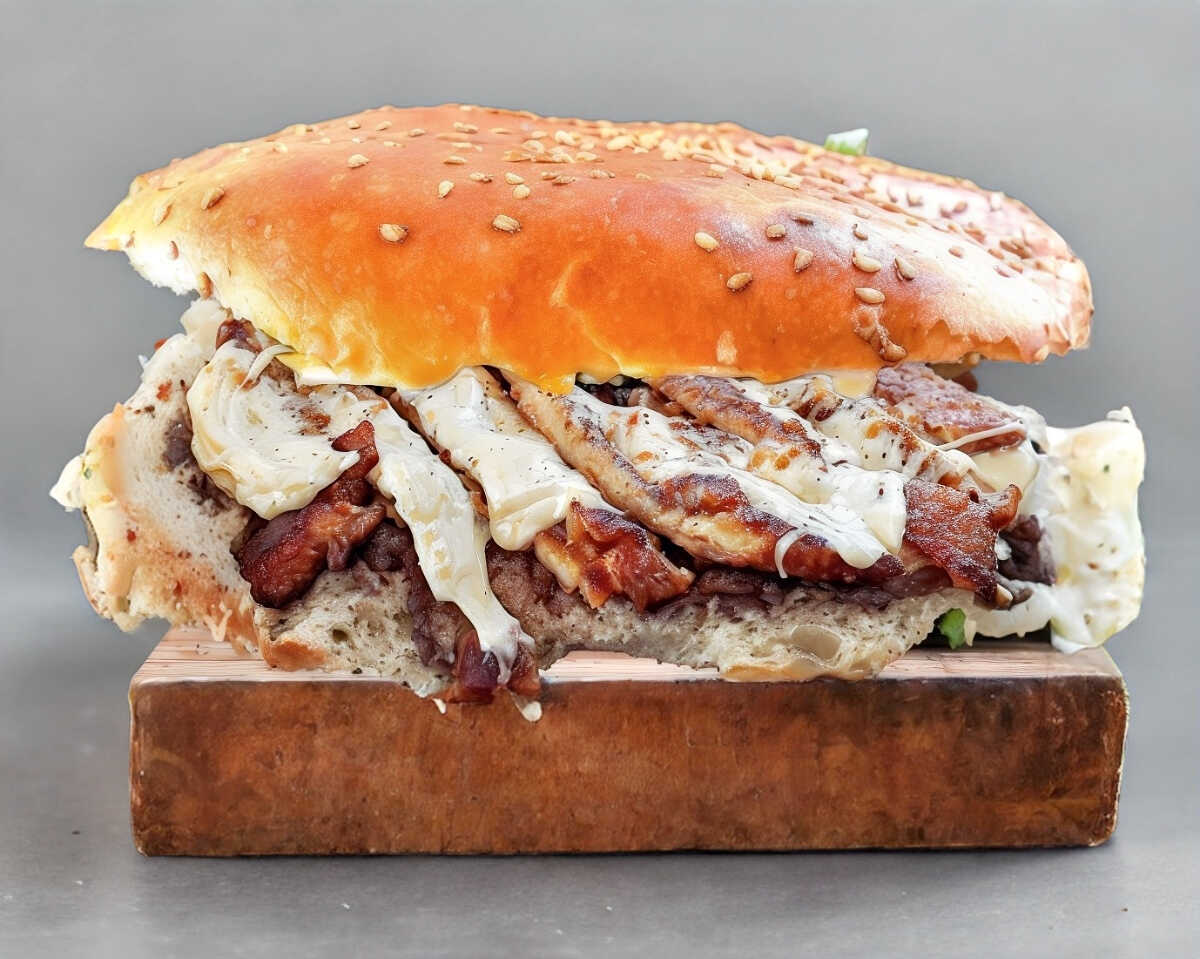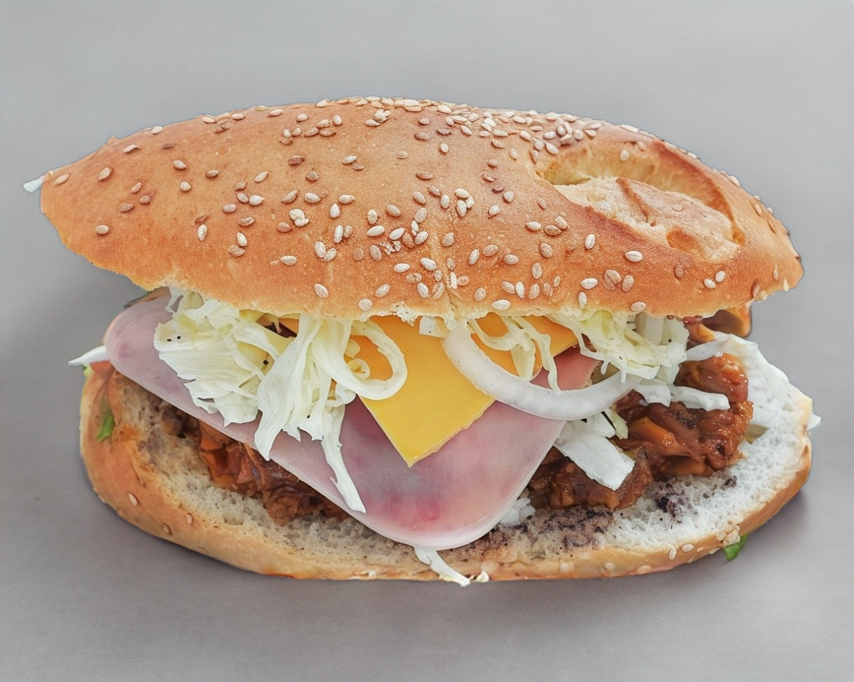 Carne de arrachera, jamón de pavo, tocino, queso americano y queso oaxaca, la guarnición lechuga, tomate, cebolla, salsa cátsup.
