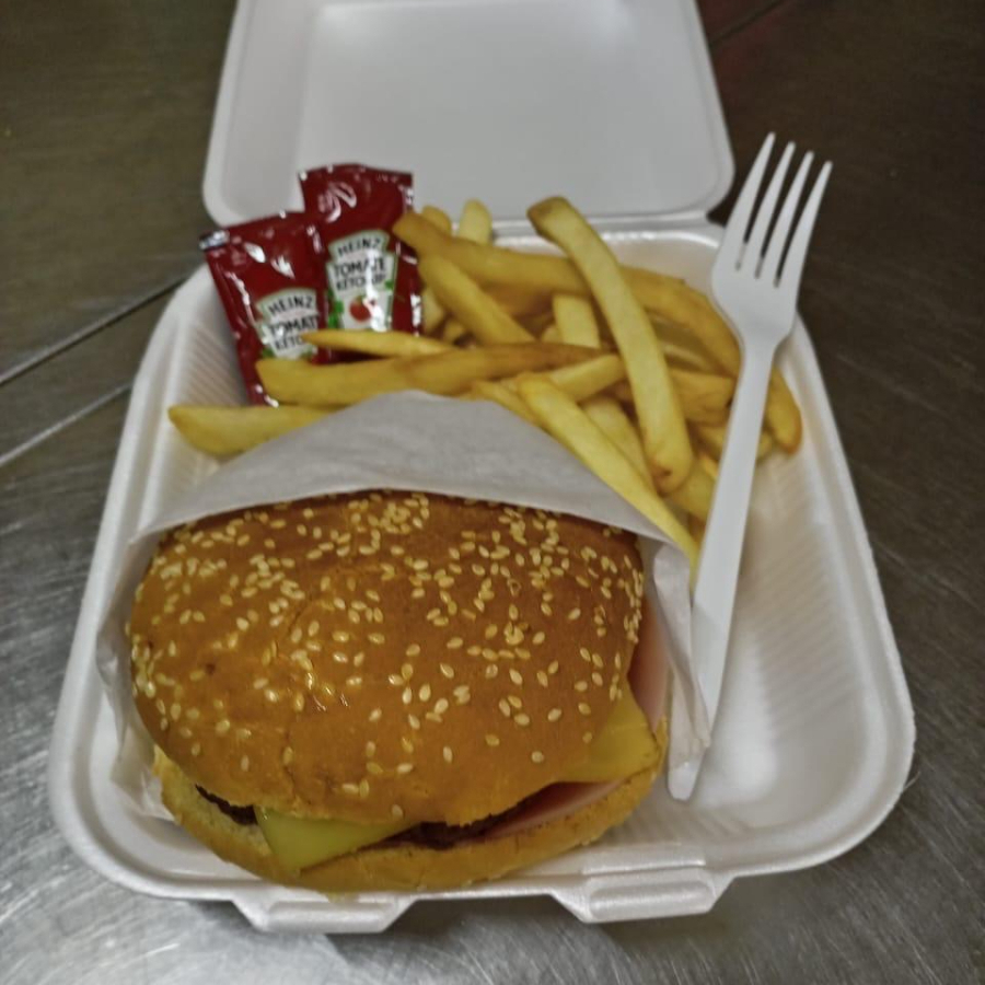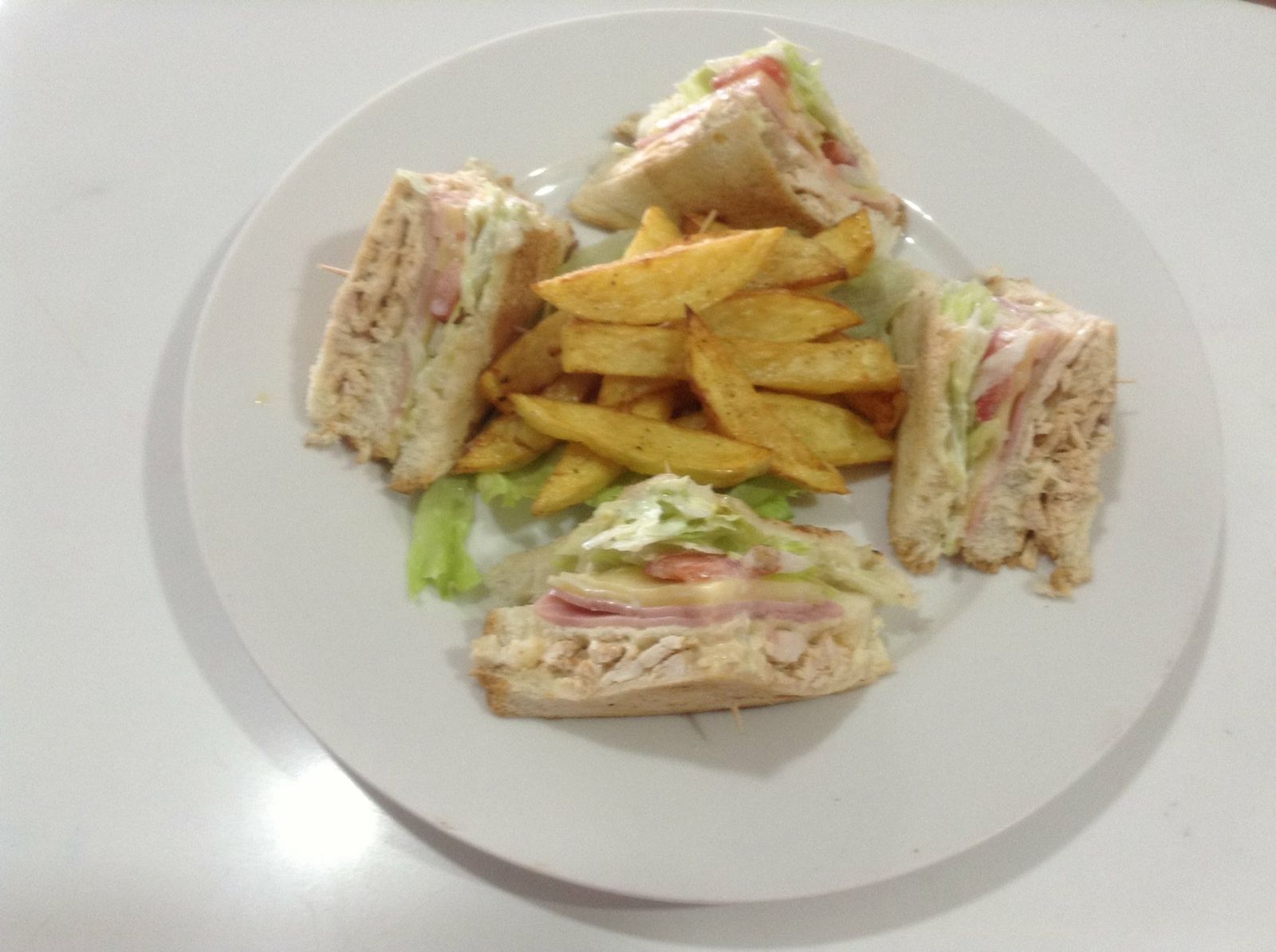 3 REBANAS DE PAN BIMBO,JAMON ,QUESO , POLLO, LECHUGA , TOMATE, AGUACATE ACOMPAÑDA DE PAPAS FRITAS