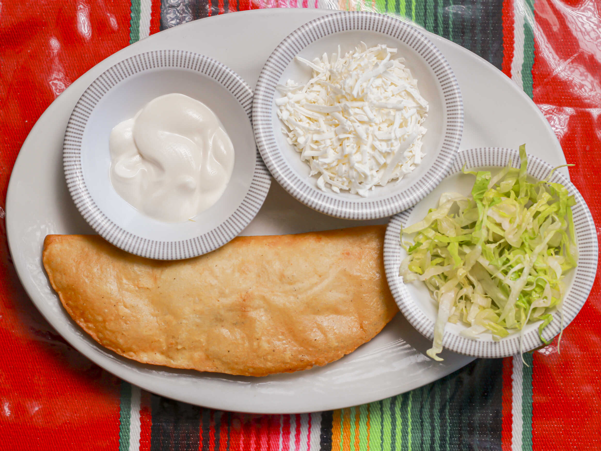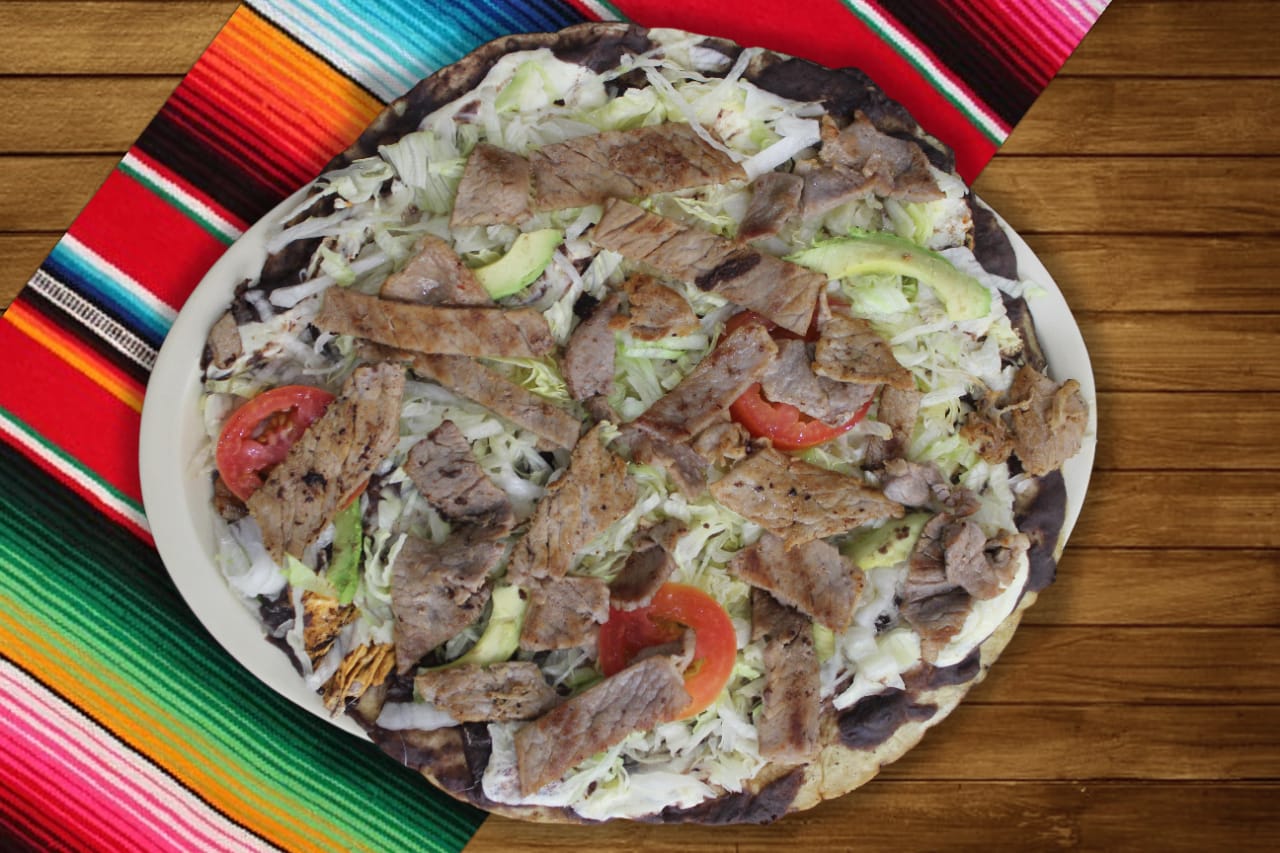 Tortilla original de Oaxaca, frijoles, lechuga, tomate, aguacate y cecina