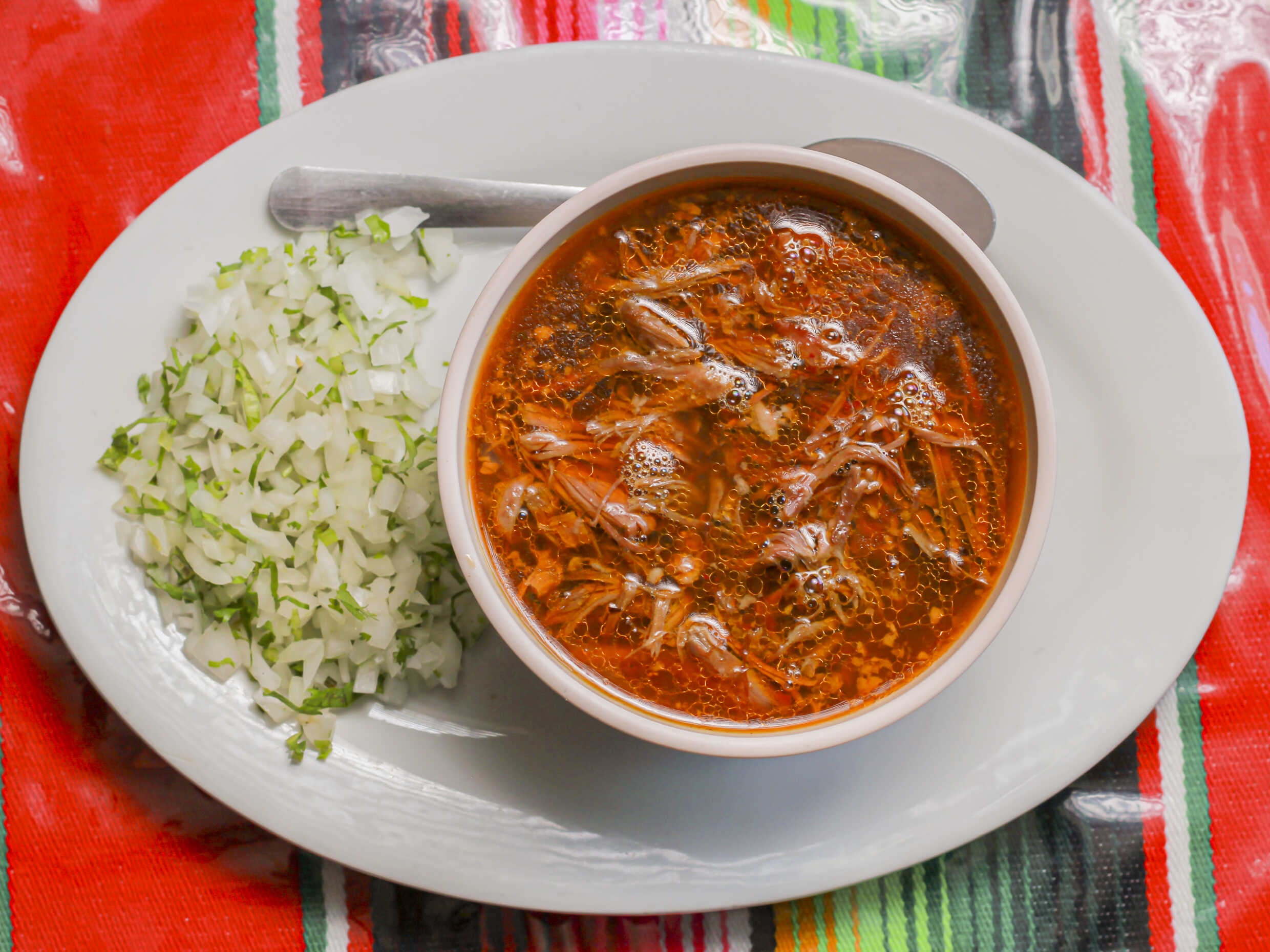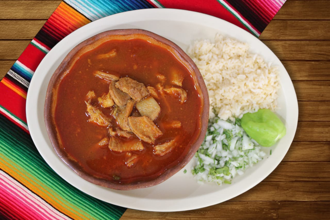 DE CARNE DE PUERCO CON MAIZ POZOLERO , LECHUGA,RABANOS , CEBOLLA Y LIMON