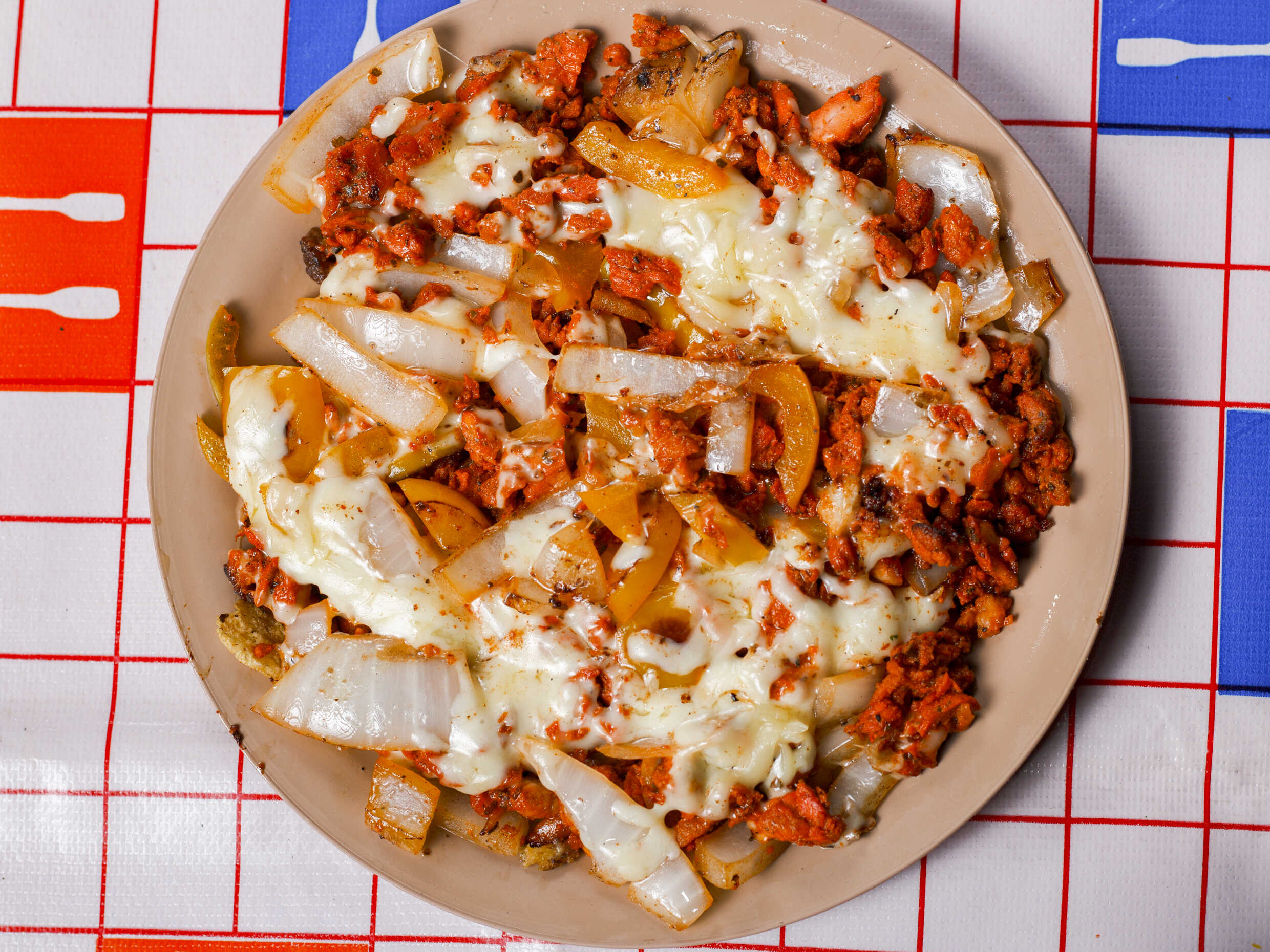 280 gr de carne, cebolla y pimiento morròn asados, con queso