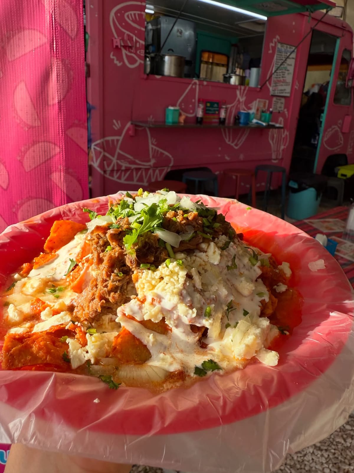 chilaquiles rojos con crema, queso y cebolla al gusto, con cualquier guiso disponible en la parte de arriba