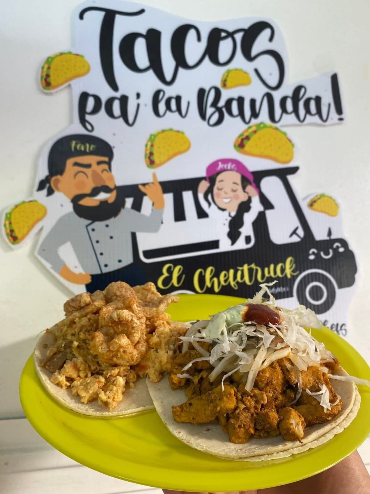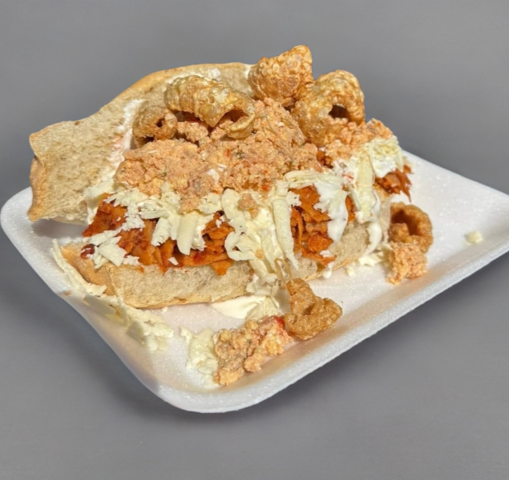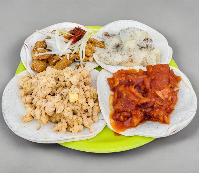 1Taco personal, tortilla de maíz, relleno sudado o vapor, chicharrón prensado, tripón con chorizo. tapa con chorizo y mole con pollo