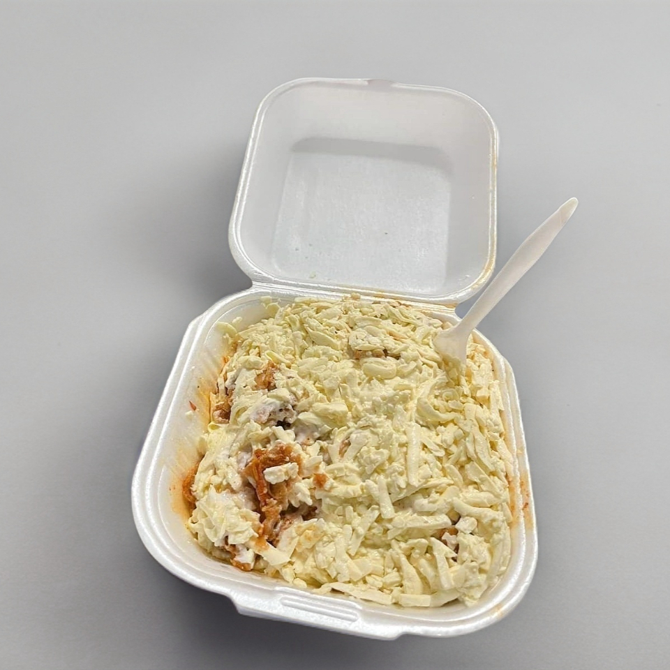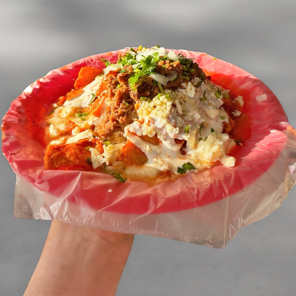 Chilaquiles 600 gr - Totopos de maíz fritos, bañados en salsa roja, con crema y queso. SIN BEBIDA