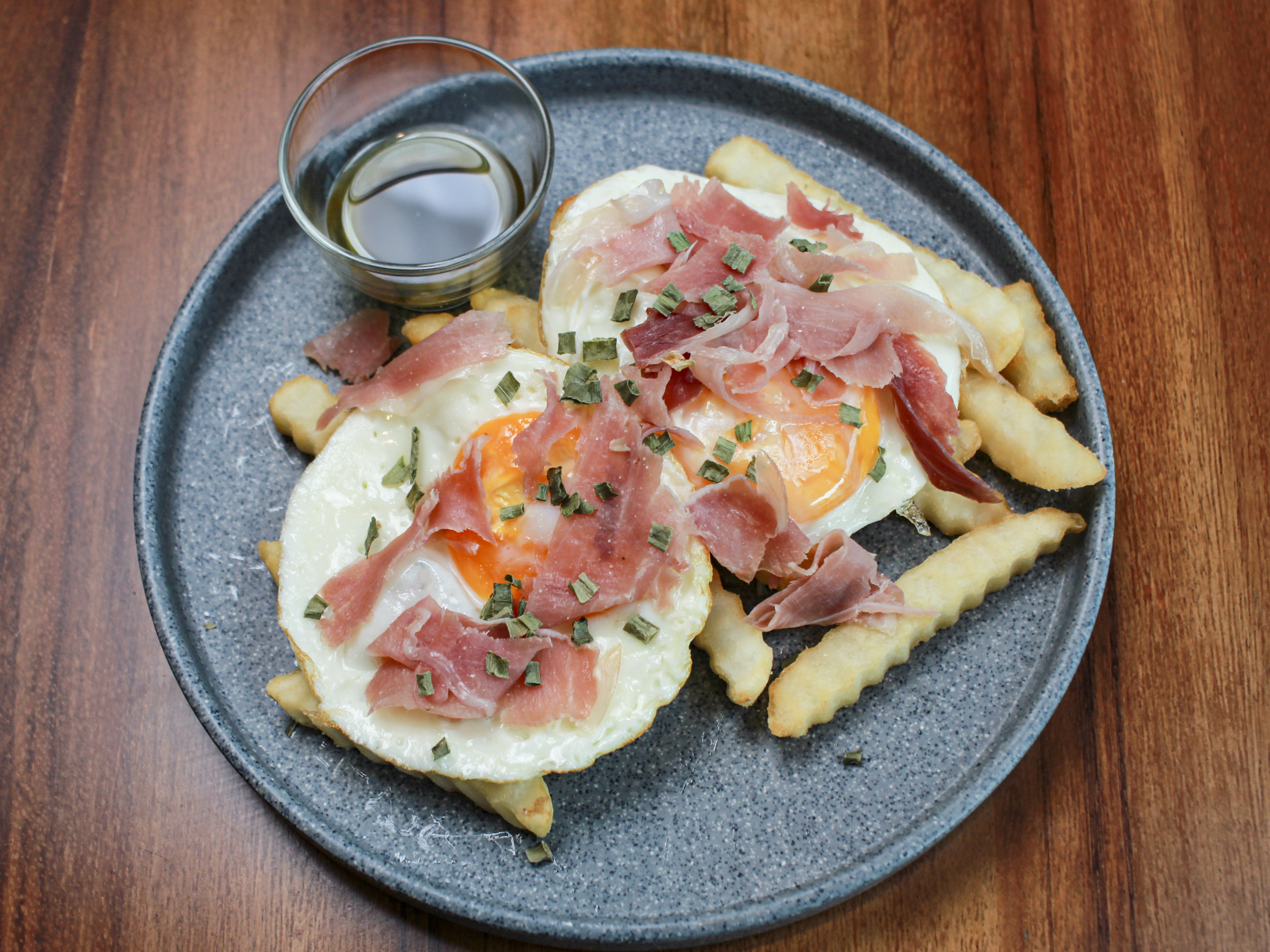 Queso ahumado, huevos estrellados, jamón serrano, tomate cherry y aceite de oliva.