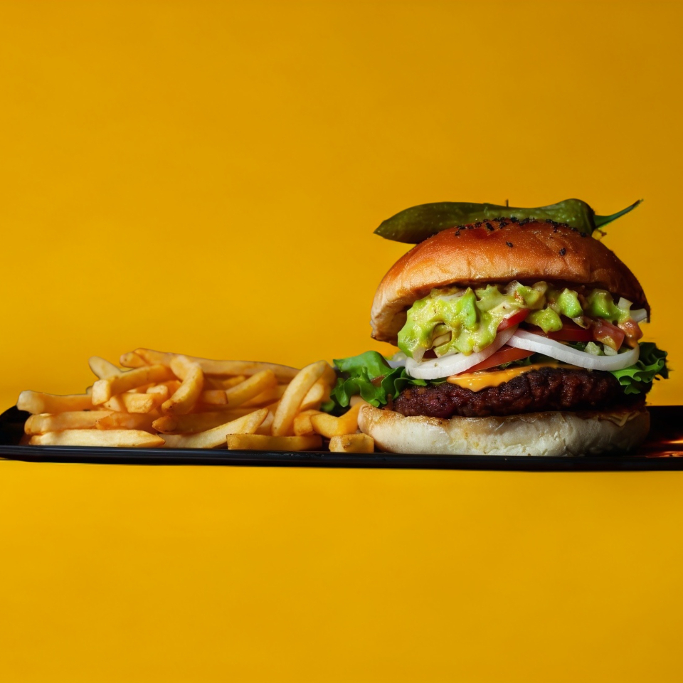 Carne arrachera de res, queso cheddar, tocino, chile verde tatemado, cebolla caramelizada y guacamole a la mexicana