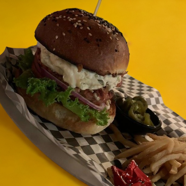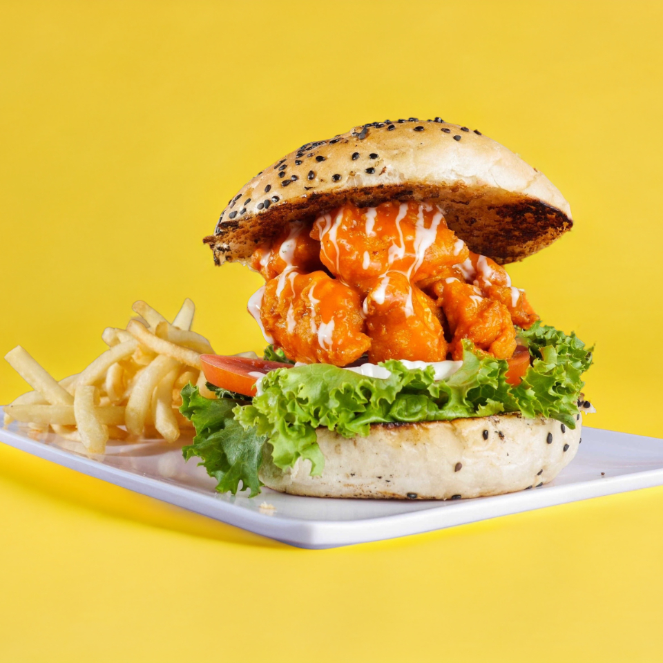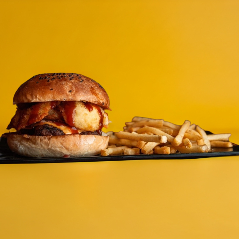 Hamburguesa especial de pechuga de pollo empanizada, cebolla caramelizada, queso cheddar, tocino ahumado, queso gratinado y aderezo spicy chipotle