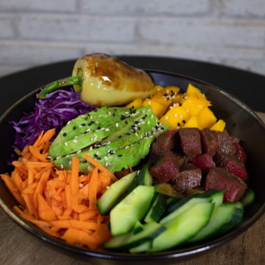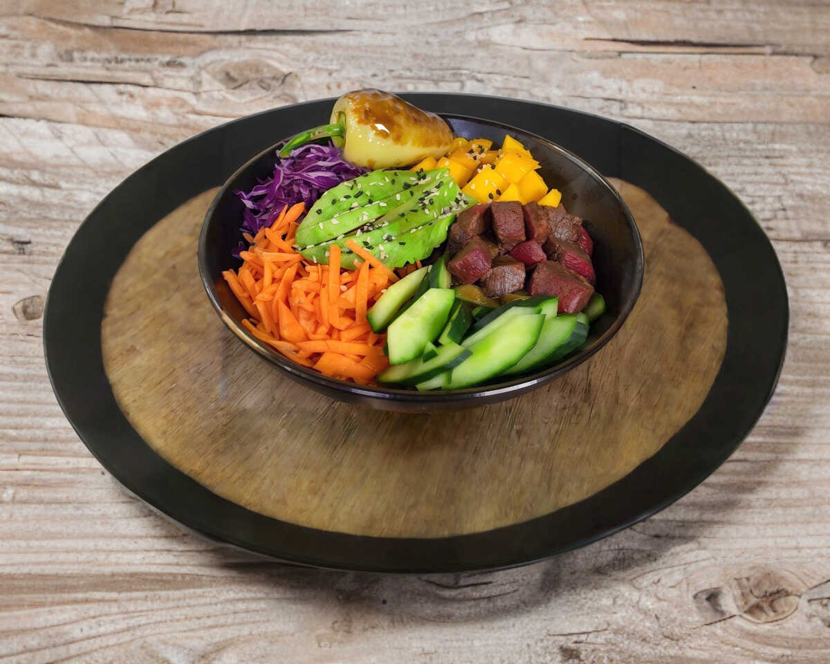 Cama de arroz blanco, medallón de atún marinado, aguacate, zanahoria rayada, col morada, pepino, mango, acompañado de salsa ponzu y aderezo chipotle de la casa.