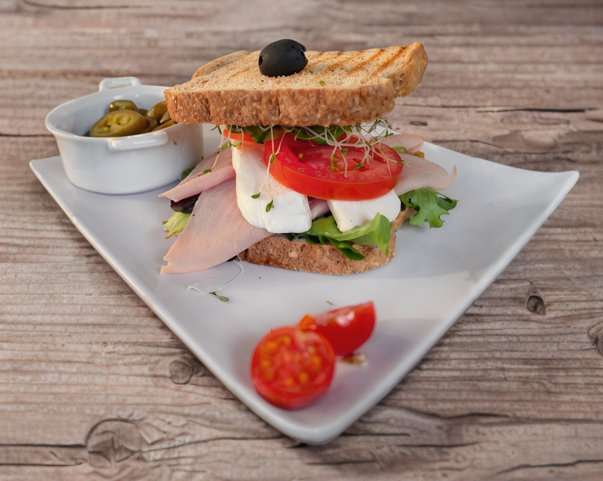 Pechuga de jamón de pavo, queso panela, tomate, lechuga, aguacate y germinado, acompañado de jalapeños.