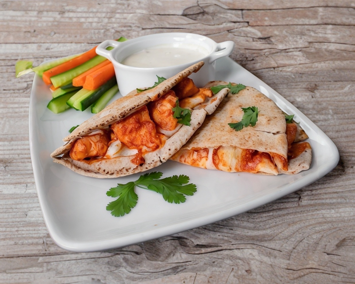 Quesadillas en pan pita con pollo búfalo con cilantro y aderezo ranch de la casa