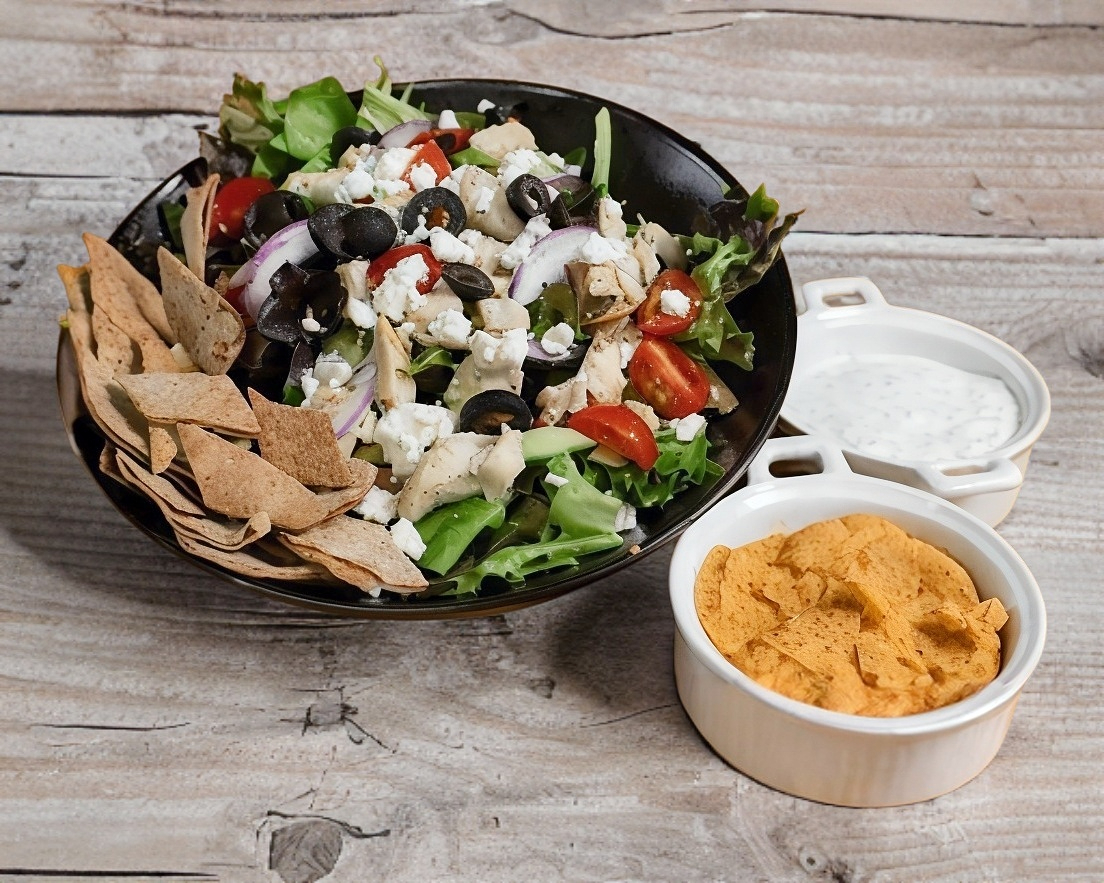Lechugas mixtas, tomate cherry, aceitunas, cebolla morada, queso feta, pollo acompañado de hummus y aderezo de la casa.