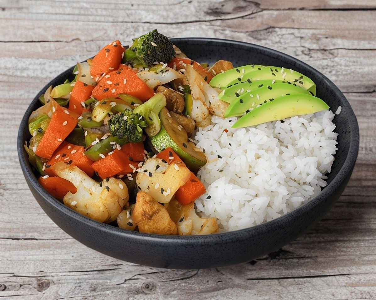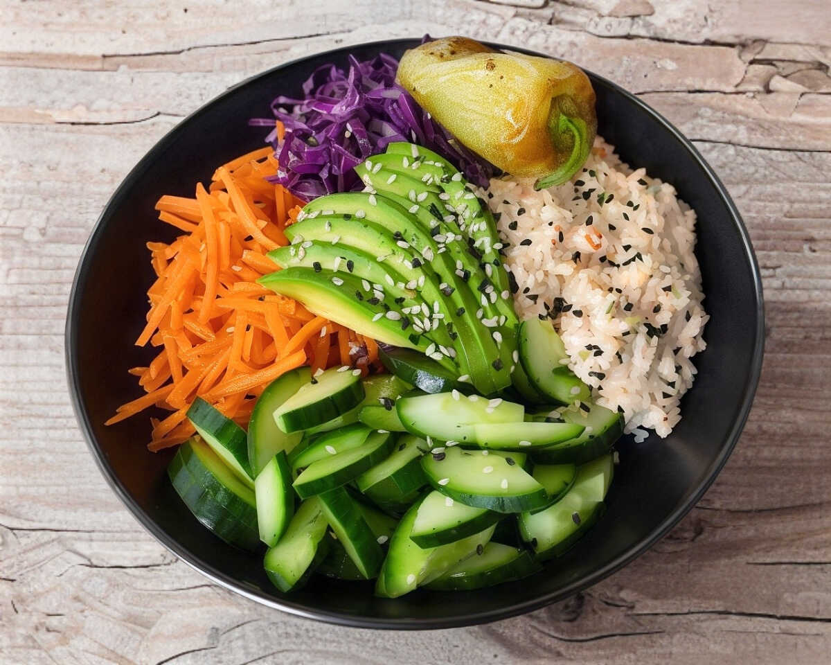 Cama de arroz blanco, surimi preparado, aguacate, zanahoria rayada, col morada, pepino, acompañado de salsa ponzu y aderezo chipotle de la casa.