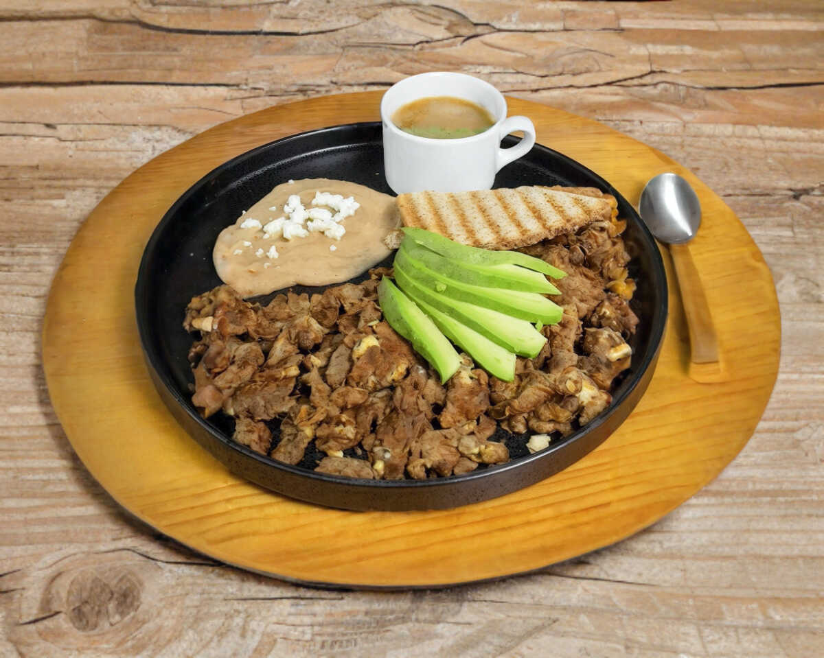 A la mexicana, chorizo, machaca, jamón. Acompañados de salsa verde o roja frijoles negros, queso panela, aguacate y pan.