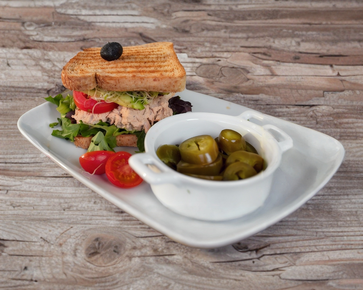 Atún al chipotle , lechuga aguacate, tomate y germinado, acompañado de jalapeños.