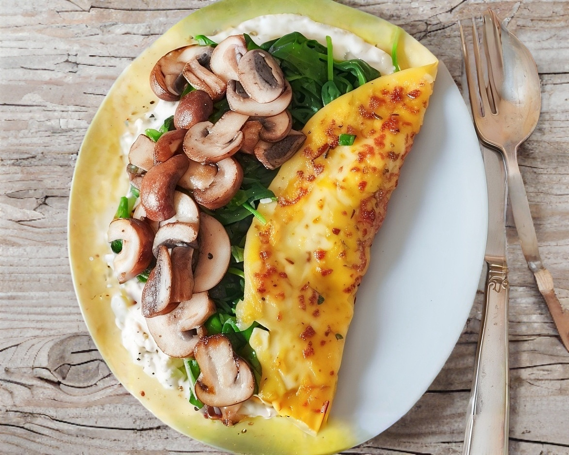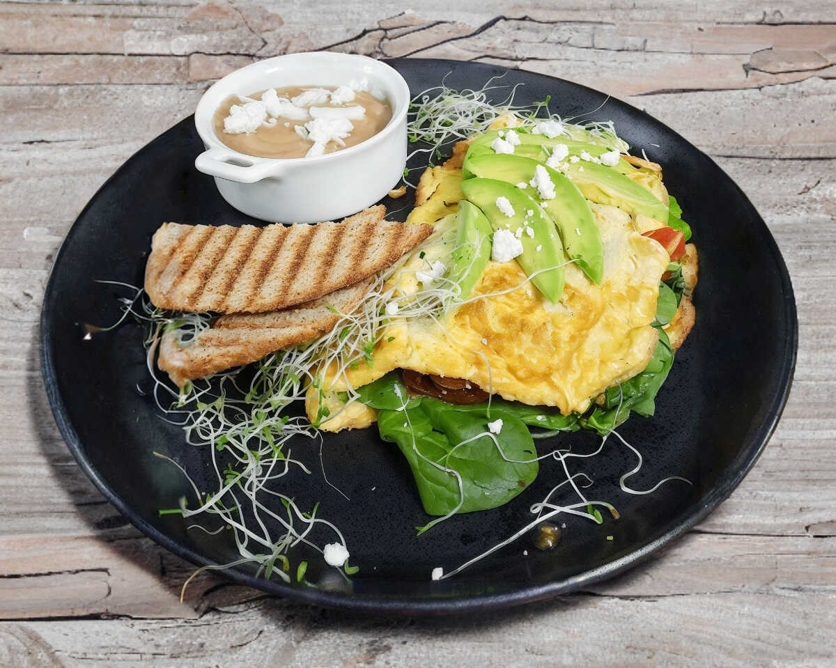 Omelette de 2 huevos relleno de espinacas, tomate cherry y queso de cabra acompañado de pan con aguacate