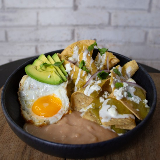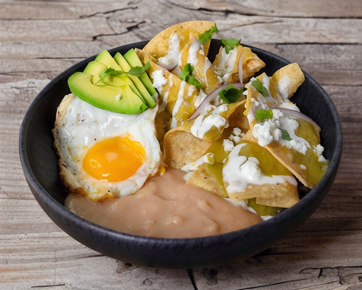 Totopos horneados con salsa verde o roja, acompañados de frijoles y huevo al gusto.