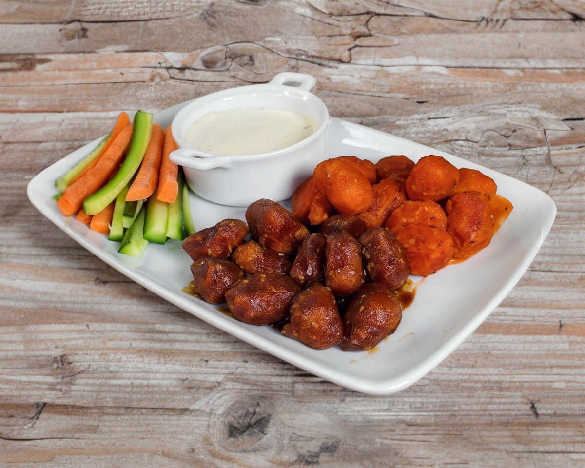 Empanizados con chicharrón de cerdo en airfryer , salsa búfalo, acompañados de apio, zanahoria y aderezo ranch