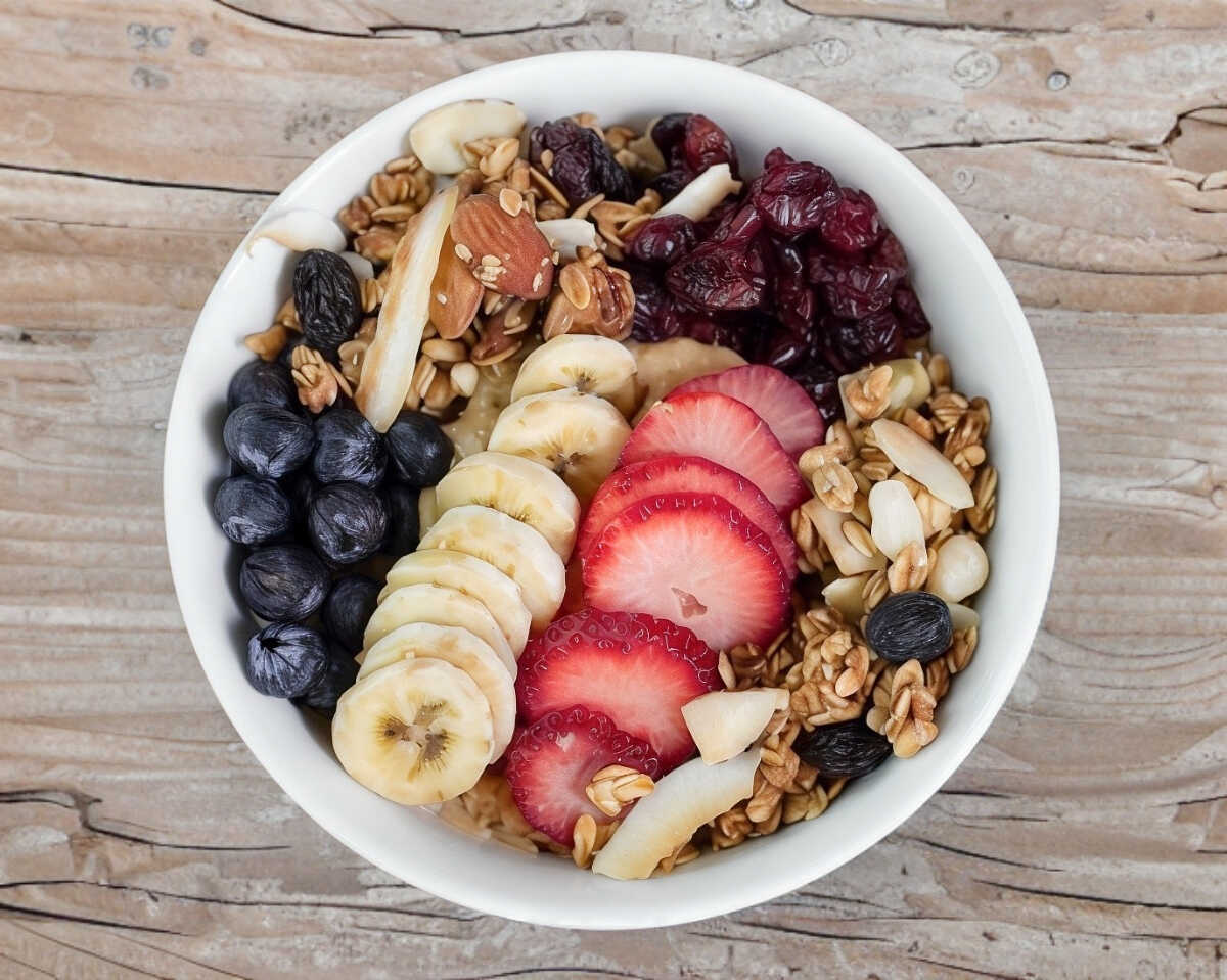 Avena, leche de almendra, plátano, berries, granola y crema de cacahuate