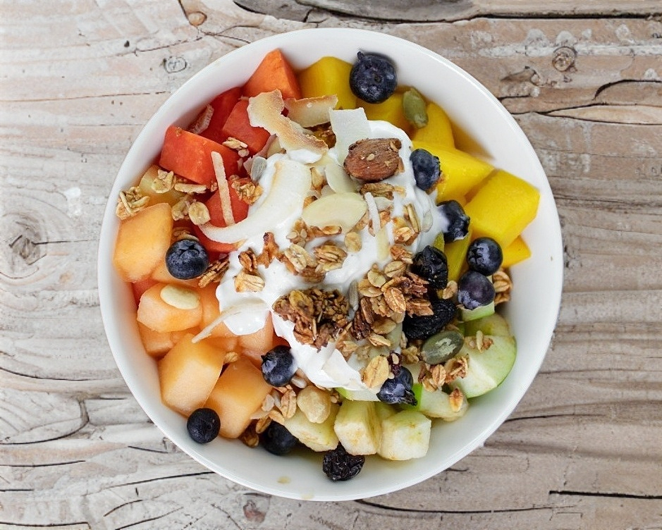 Fruta de temporada, yogurt griego, canela, miel maple sin azúcar y granola.