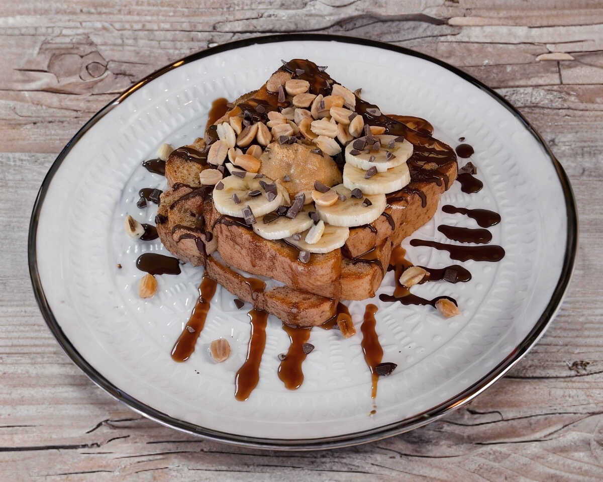 Pan francés de yogurt griego, ON TOP chocolate obscuro , cajeta sin azúcar, plátano ,crema de cacahuate, cacahuates y chispas.