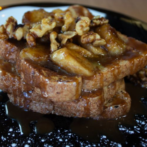 Pan francés con plátano caramelizada acompañado de cajeta sin azúcar.