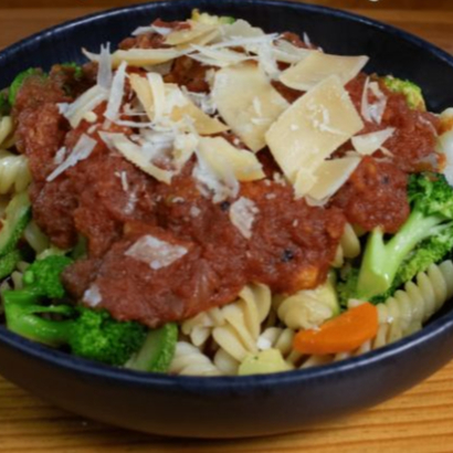 Pollo a la plancha en salsa pomodoro con vegetales y queso parmesano.
