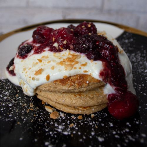 Base de proteína sin carbs, queso crema, huevo, vainilla y fruta del monje: ON TOP frutos rojos, crema de almendra y coco sin azúcar