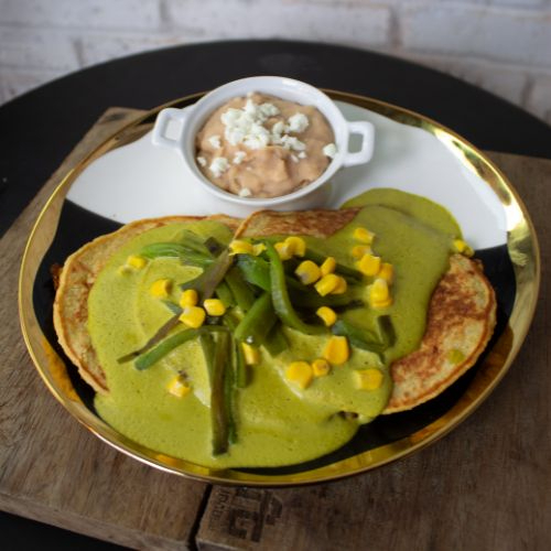 Base de harina de avena con elote dulce, crema de chile verde y frijoles.