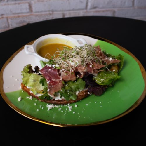 Pan de masa madre, queso crema, salmón ahumado, cebolla morada, alcaparras, germinado, chile quebrado y vinagreta de la casa.