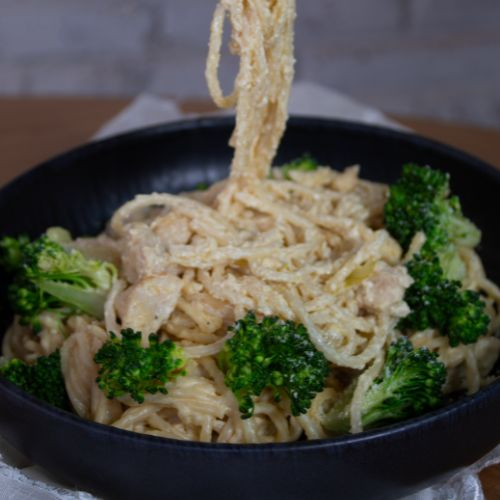 Pollo a la plancha en salsa alfredo, brócoli y queso parmesano; acompañado de ensalada mixta.