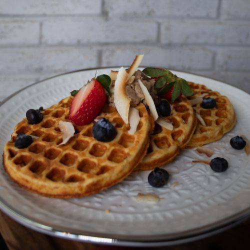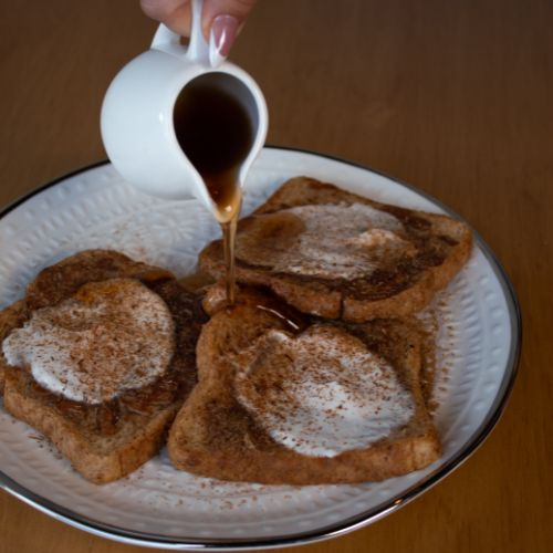 Pan fránces relleno de fresas, platano, queso ricota, canela y miel maple acompañado de berries.