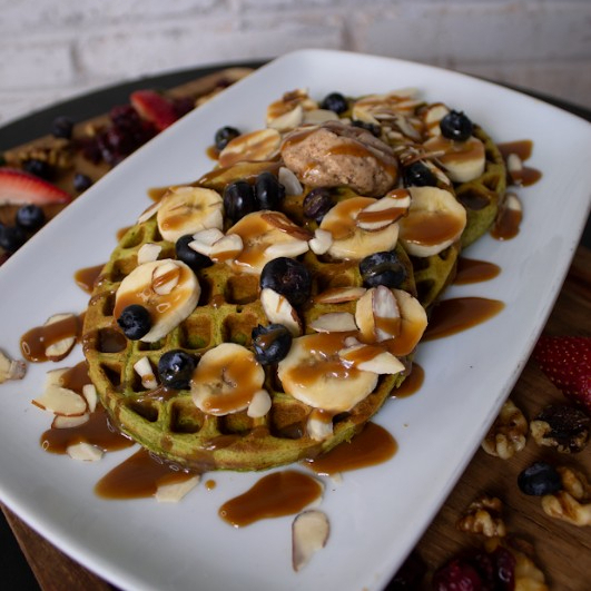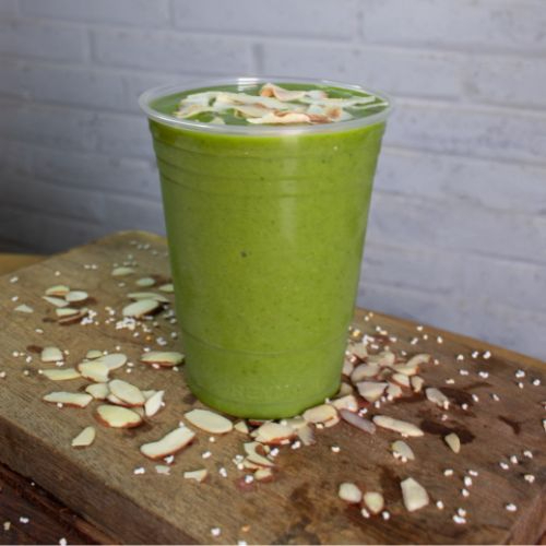 A base harina de avena, espinacas, plátano, macha organico, yogurt griego, crema de almendra y miel maple sin azúcar, acompañado de plátano y almendra fileteada.
