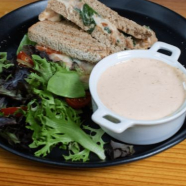 Pan de avena sin gluten, pollo a la plancha,pesto, espinacas, queso oaxaca y tomate acompañado de aderezo ranch de la casa.