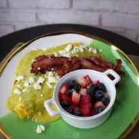 Relleno de jamón y queso bañado en crema poblana acompañado de tocino y frutos rojos.