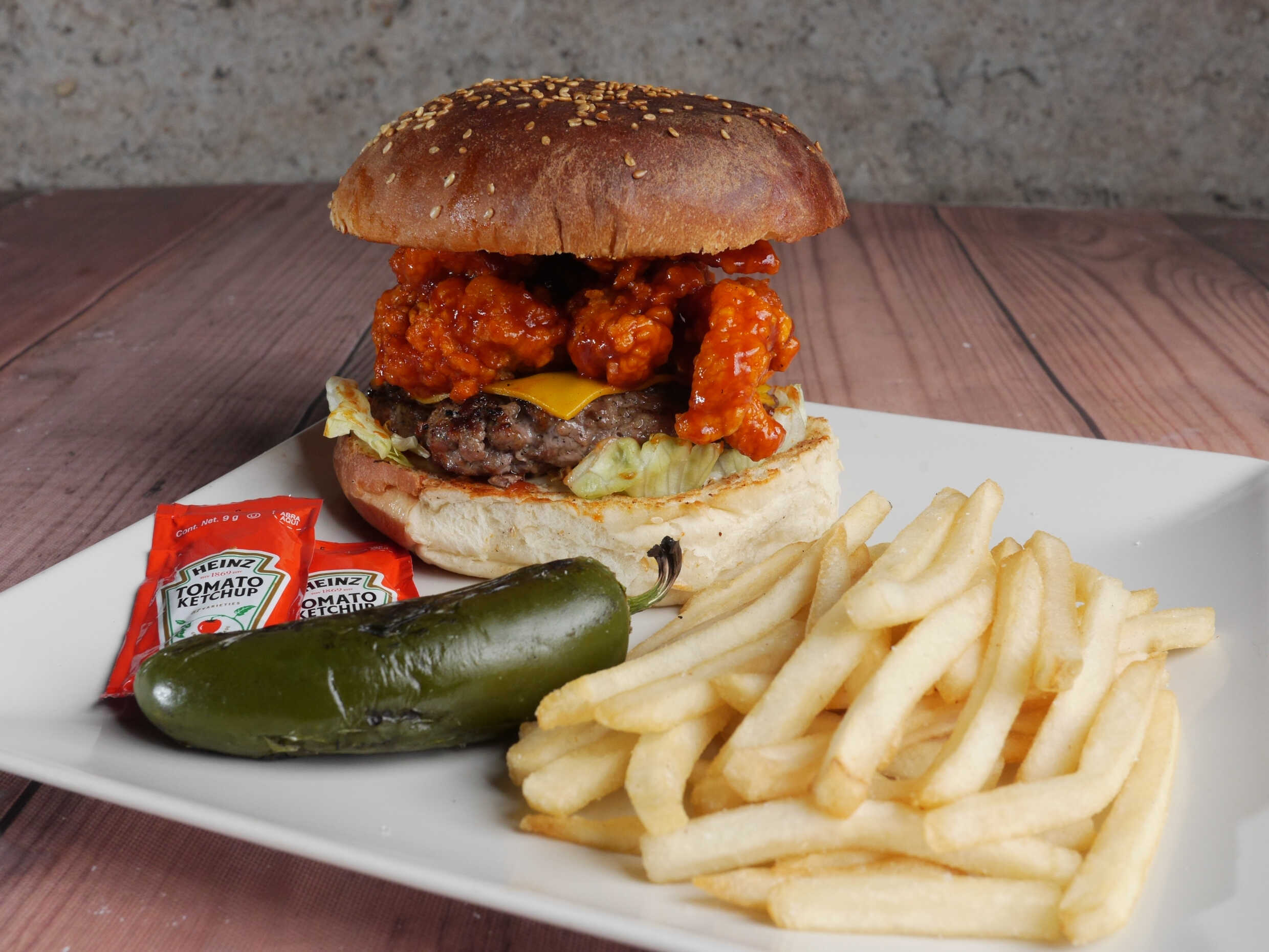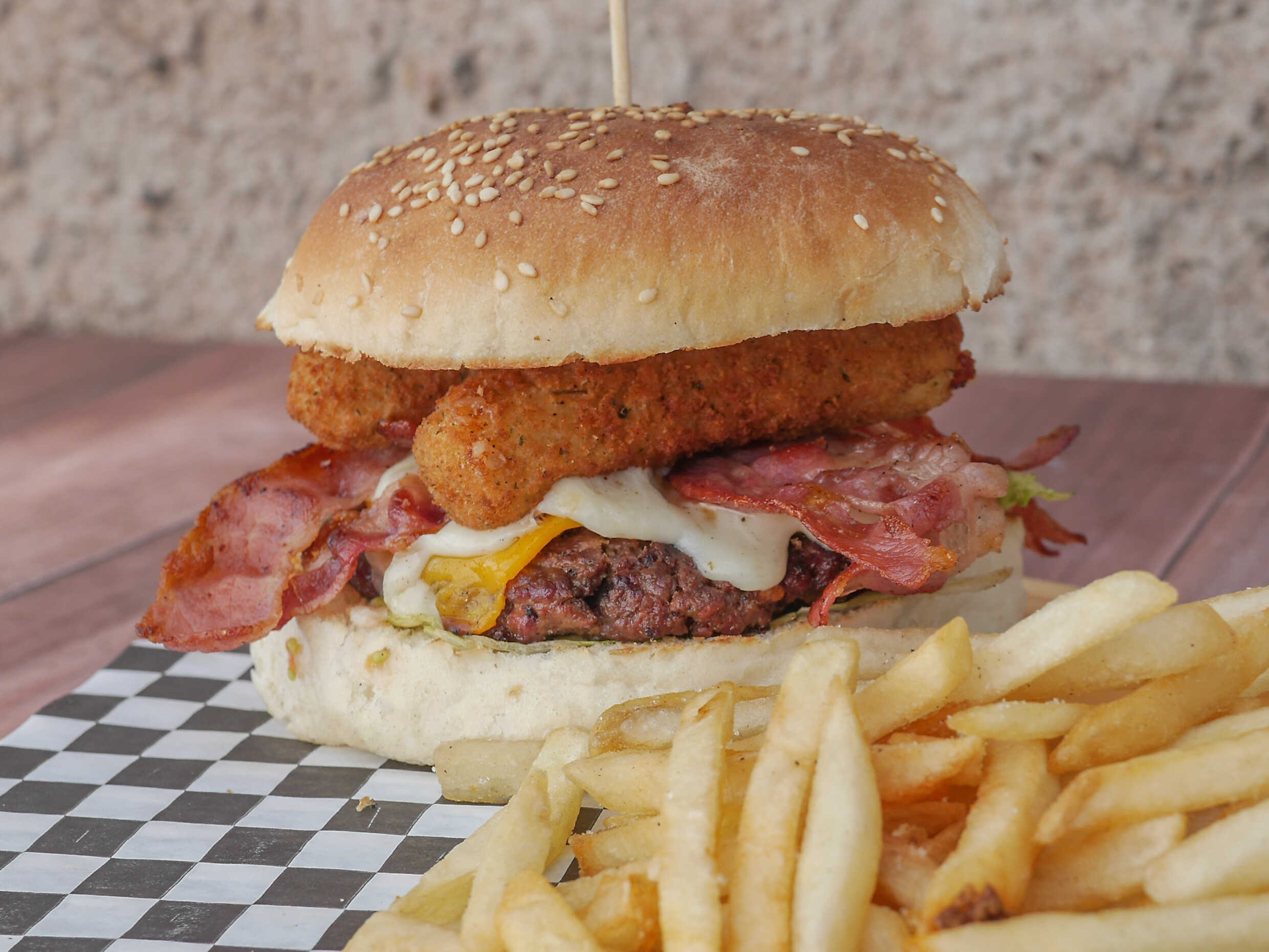 170 gr de carne de res, queso americano, lechuga, mayonesa, tocino, 2 piezas de dedos de queso. Acompañada de papas a la francesa.