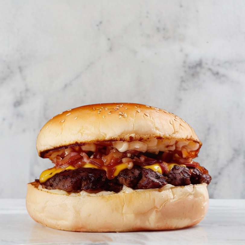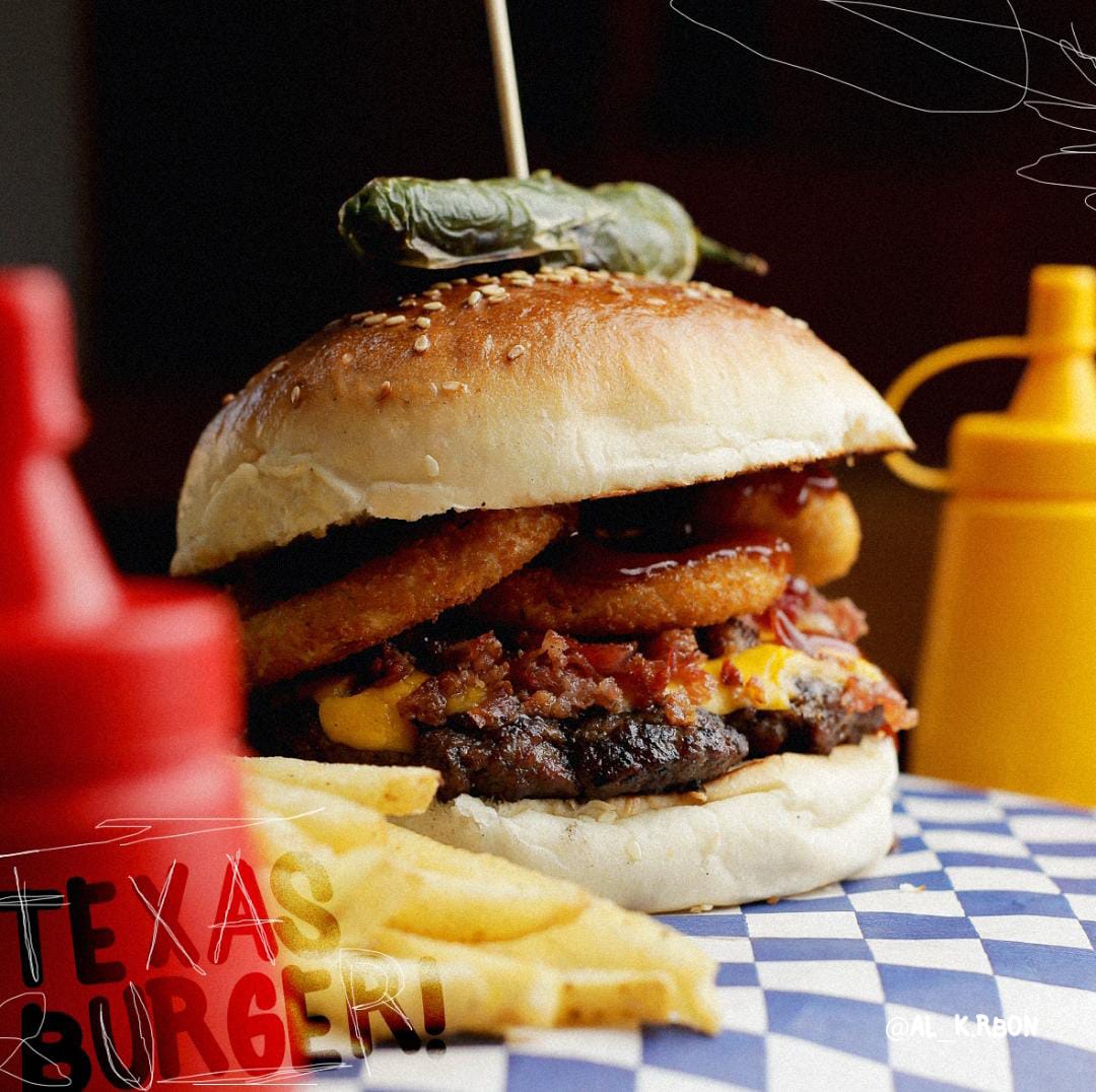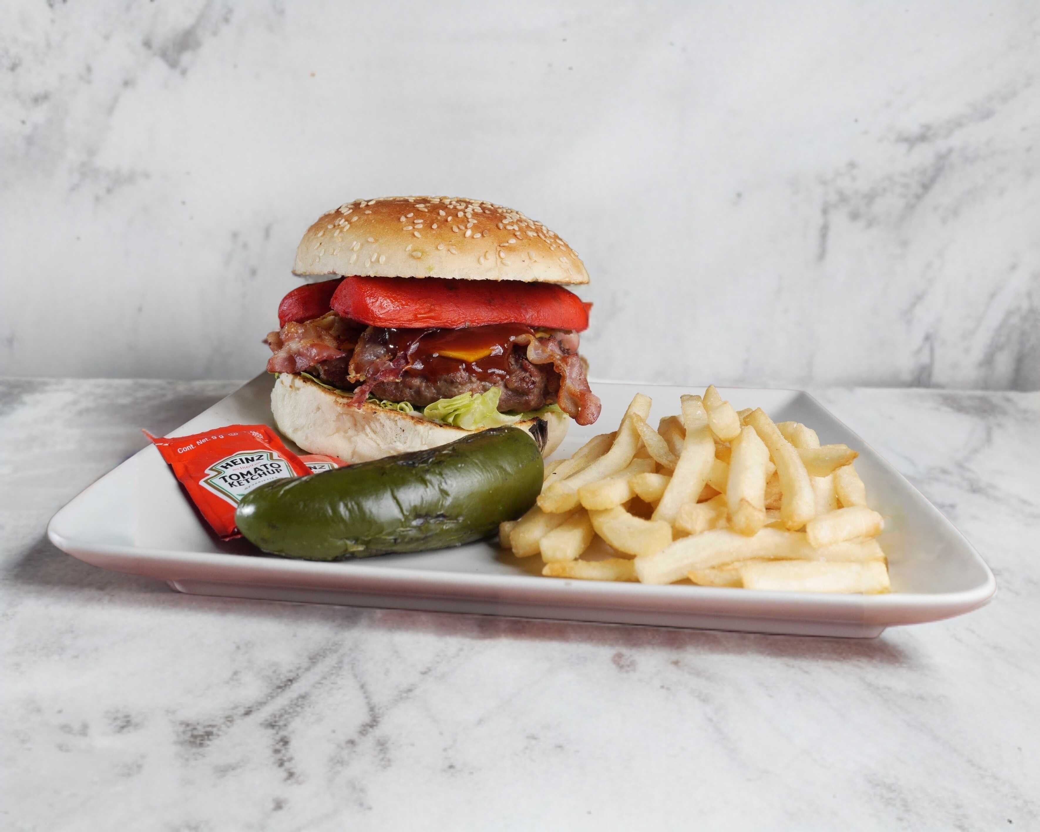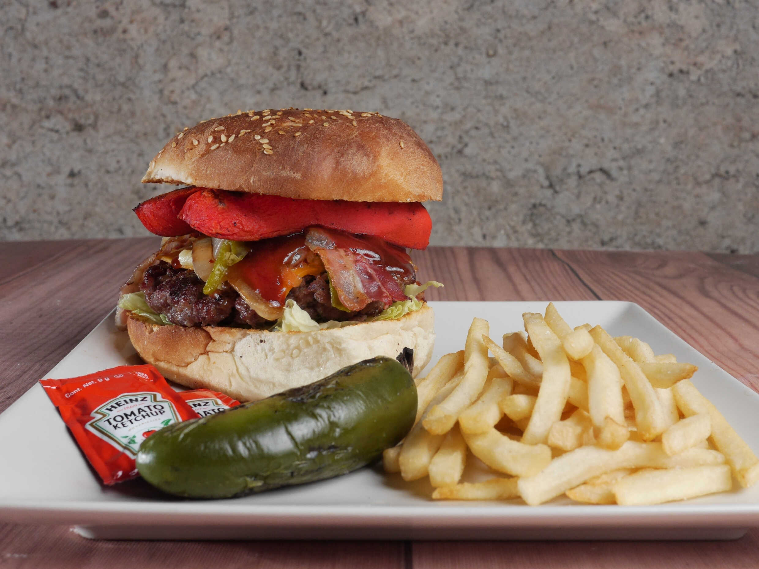 170 gr de carne de res, queso americano, queso chihuahua, lechuga, tomate, cebolla asada, chile verde tatemado, mayonesa, tocino, salchicha para asar, y bañada en salsa BBQ (opcional), acompañada de papas a la francesa.
