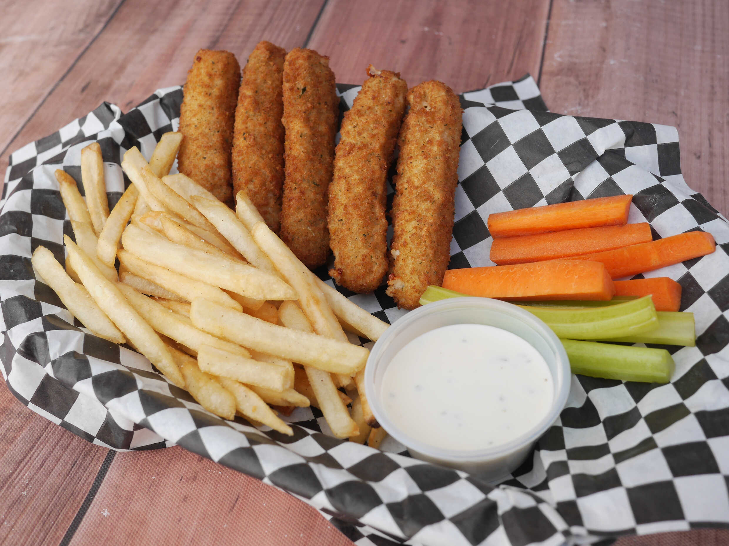 5 Piezas de dedos de queso, acompañados de papas a la francesa, apio, zanahoria y aderezo ranch.
